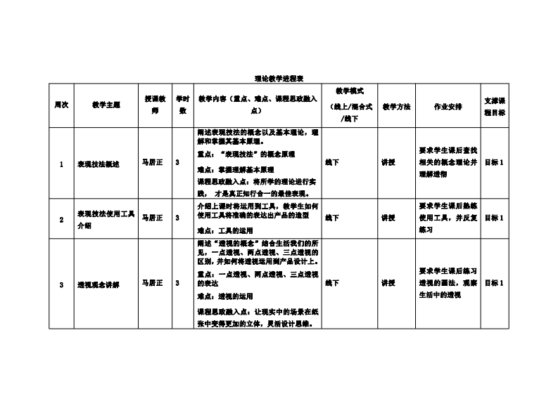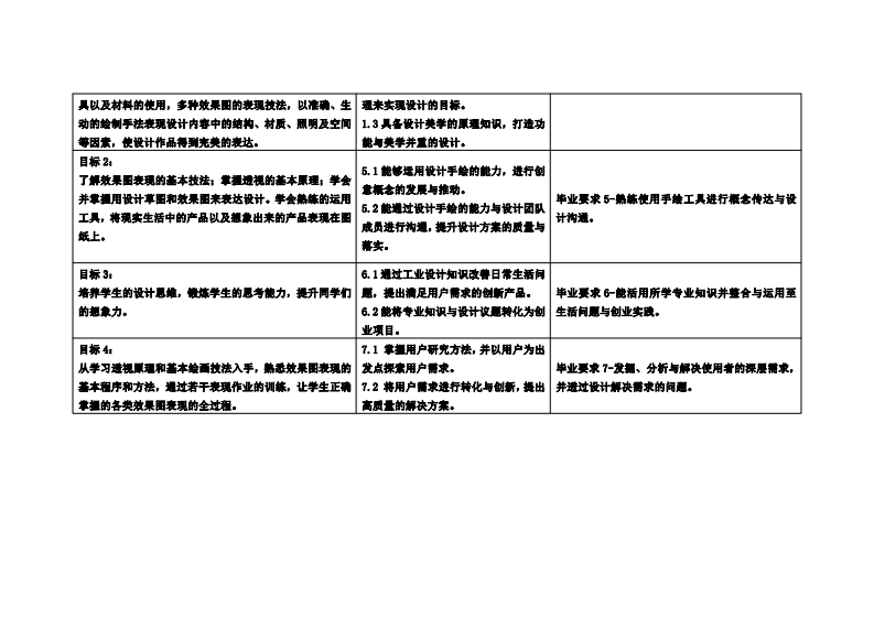 《设计表现技法》教学大纲课容名称:设计表现技法课程类别(必修/选修)多必棒课程英文名称:Produet design and sketch training总学时/周学时/学分:48/3/3其中实险/实戒学时,32先能课是:设计家播后续课程支撑:产品设计授课时间:1-16周周一24节提课地点:实406提课对靠:2024鞭工业设计1班开课学洗:粤台产业科技学陕任课数师姓名/积称:马居正/饼师容疑时间、地点与方式:1.课堂:每次课前、课间和课后进行答展:2.线上:通过邮件线上答鞭。课程考核方式:开卷()闭卷()课程论文()其它(√)使用敏材:《产品设计手飨表现技法》郑志恒、史慧君等化学工业出版社《工业产品设计手维与实成自学使程》陈玲江人民邮电出版社课程简介:本课程是工业设计专业的基础造修课程,绘制效果图是工业设计专业举生必名的基本技能。妆学目的和任务是培养举生的表达能力,通过本课程的学习,使举生能够把自己的构思先整、光美地表达出来,学会运用各种不同的表现季法和不同的工人来表现构思。课程妆学目标及对毕业要求指标点的支撑:裸和妆学目标支撑单业要求指标点单业要求目标1:1,1掌量工业设计的基础知识,能清所毕业要求1-熟练运用设计善础知识,餐能制造知识通过该课程的学习,使学生了解设计表现技法的应用目地将设计想法呈现。与美学知识的能力。的、置要意义,理解色影和边视等基驰知识,掌摄绘图工1,2能够理解智能制造的基本振老和原