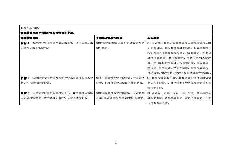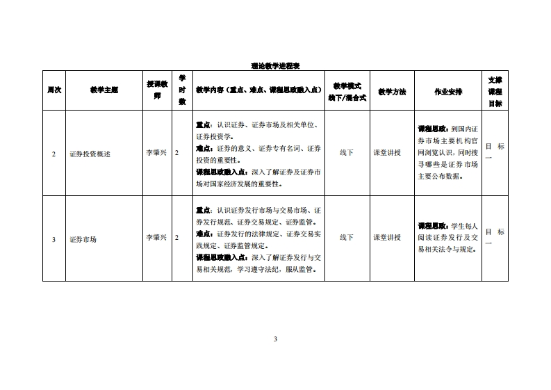 《证券投资理论与实务》教学大纲课避名称,证券投资理论与实务课忍类别(必修选修)事选修课程英文名称:Securities Investment总学时周学时学分,3222其中实险实戒学时,16先继课是:财务管理、财务报表分析后续课程支撑毕业实习漫课时间:1-16周星期五(1-2节)援地点:莞城实217课对津:21级经济与金融专业2班(金融管理开裸学陕:粤台产业科技学院任课就甲姓名淋:李策兴/副教授答展时间、地点与方式:1课堂:每次上课的课前、课间和课后进行答疑:2课外:可直接到2307办公室进行答凝:3线上:建立微信课程群,实施线上答疑。课庭考楼方式:开卷()闭卷()课程论文(/)其它()使用微村:证券投资理论与实务(第5版王军旗编着)中国人民大学出版社S:978-7-300-27746-2妆学事考责料:证券投资学基本原理与中国实务(第5辰王德宏编着)中国人民大学出辰社课避情介:1,介绍股景、债券、投资基金、金融衍生工具这四种基本投资工具的原理,帮助同学掌握最基本理论知识,为后续学习或实践莫定坚实的基础。2,结合证券业从业资格考试的要求,重点拓展了证券投资法令与实务内容,帮助同学更多地掌握相关知识3.增加实践操作及案例,补充学习拓展的内容,帮助同学扩大视野,在工作及生活增加应用能力。4.压缩了一些过难过深的理论闸述,对全书结构进行了重新梳理安排,力求使逻辑体系更加严密,帮助同学更好地理解和掌握证券投资的基本原1
