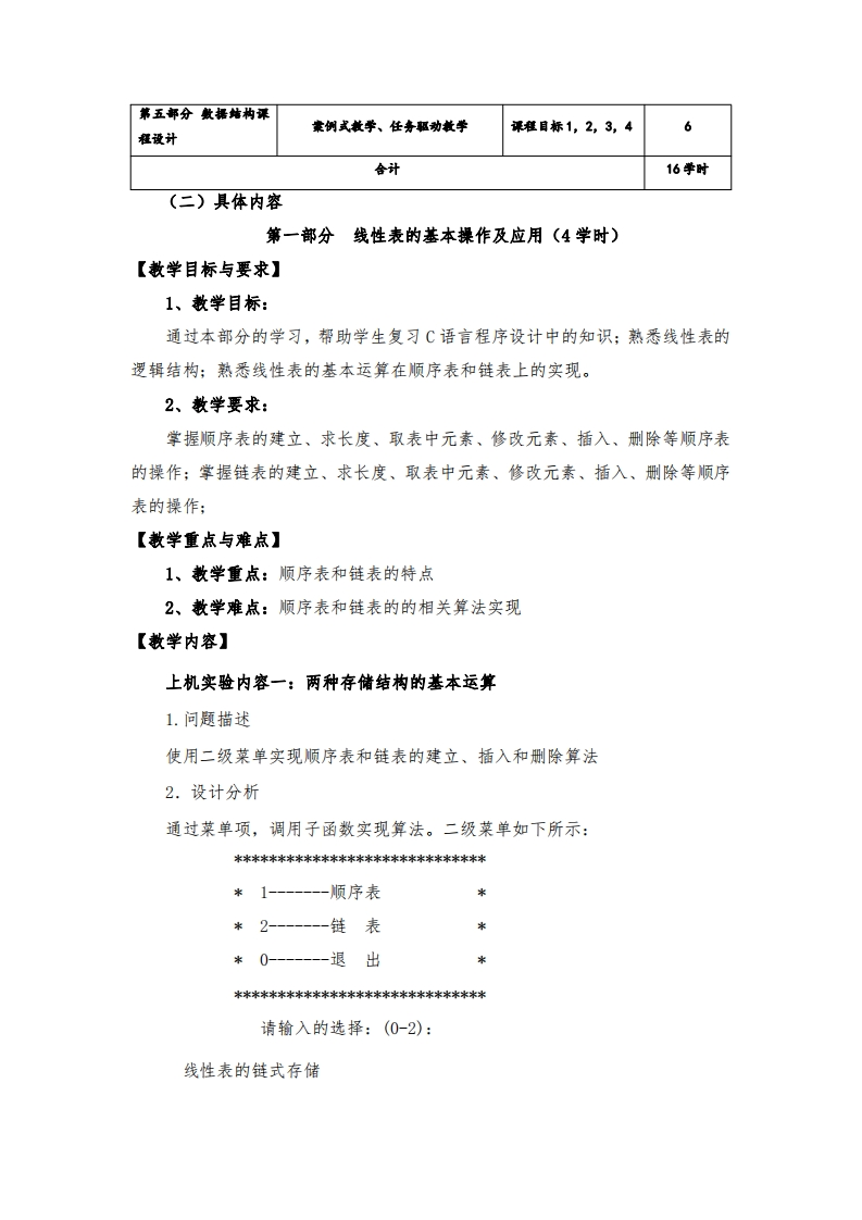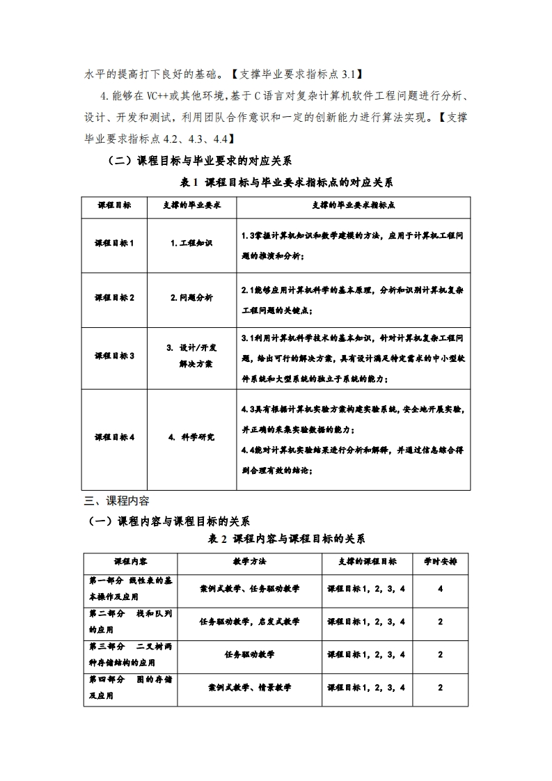 《数据结构实验》课程教学大纲一、课程信息课程名称:数据结构实验Experiment of Data Structure课程代码:06E4115B课程类别:专业核心课程适用专业:计算机科学与技术专业课程学时:16学时课程学分:0.5学分修读学期:第四学期先修课程:程序设计基础,离散数学,概率论与数理统计二、课程目标《数据结构实验》是计算机科学与技术专业的一门综合性的专业核心课程,是对学生的一种综合训练,是与课堂听讲相辅相成必不可少的一个环节。它要求理解数据结构的基本算法,并能够用程序设计语言实现这些算法,灵活运用数据结构的基本算法解决实际问题,不仅可以培养学生的创新意识,而且培养学生独立分析问题、设计算法、实现复杂编程的能力,为后续课程的学习和科研工作的参与打下良好的基础。(一)具体目标通过本课程的学习,使学生加深对课程内容的理解,培养将原理应用于实际的能力,提高软件设计、算法应用、编程及调试的综合素质。1.掌握数据结构中线性表、栈、队列、树、图等基本结构的概念以及特点,针对具体问题,正确分析并建立不同模型求解问题。【支撑毕业要求指标点13】2.能够应用数据结构模型的基本原理,学会对问题进行分析,根据具体问题的实际要求选择并构建合适的数据存储结构。【支撑毕业要求指标点2.1】3.结合实际问题,对给定的非数值问题设计并求解算法,设计出一套可行的解决方案,得出有效结果,进一步提高学生的程序设计能力,培养良好的程序设计习惯,提高学生分析问题和解决问题的能力,为后续课程的学习以及软件设计