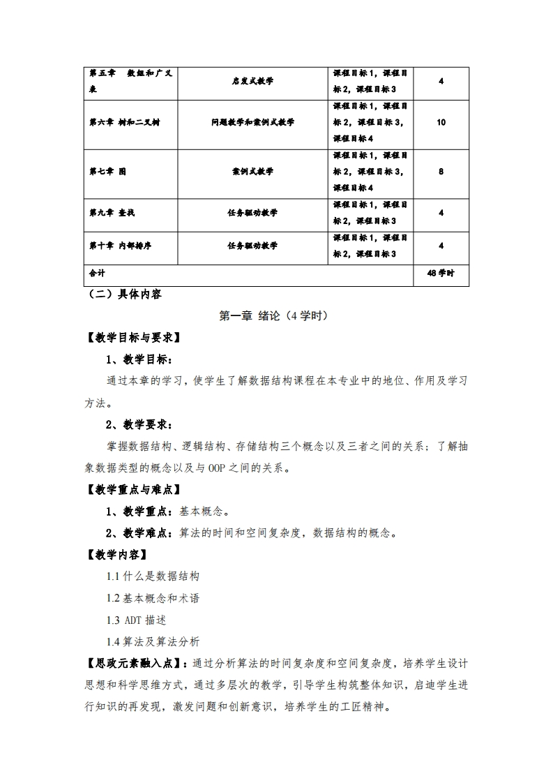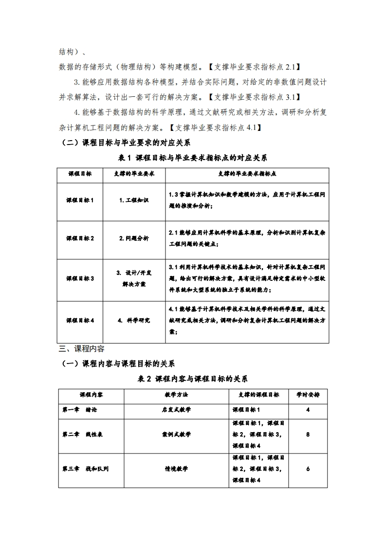 《数据结构》课程教学大纲一、课程信息课程名称:数据结构Data Structure课程代码:06E4114B课程类别:专业核心课程适用专业:计算机科学与技术专业课程学时:48学时课程学分:3学分修读学期:第四学期先修课程:程序设计基础,离散数学,概率论与数理统计二、课程目标《数据结构》是计算机科学与技术专业的一门综合性的专业核心课程之一。它系统地介绍线性表、栈、队列、字符串、数组、广义表、树、二叉树、图、查找等几种数据结构的基本概念、操作及其典型应用的例子,通过课堂、上机等教学使学生了解数据对象的特性,数据组织的基本方法,并初步具备分析和解决现实世界问题在计算机中如何表示和处理的能力,从建模、综合方面提高学生的程序设计能力,培养学生的创新意识,为后续课程的学习和科研工作的参与打下良好的基础。(一)具体目标通过本课程的学习,使学生加深对课程内容的理解,培养将原理应用于实际的能力,提高软件设计、算法应用、编程及调试的综合素质。学生达到以下目标:1.掌握数据结构中表、树、图等基本结构的特点,各结构的存储表示和所涉及的运算,完成各运算的算法及其实现方法,学会对算法的评价方法。【支撑毕业要求指标点1.3】2.针对给定问题的抽象、数据的提取、数据的组织、数据结构的确定(逻辑