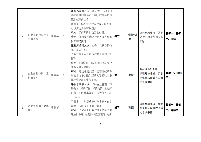 《企业兼并与合购》教学大纲课程名称:企业兼并与合购课程类别(必修选修):选修课度英文名称:Mergers and Acquisitions总学时周学时/学分:32/2/2其中实融实我学时:16先修课程:后禁课程文排量课时间:1-16周四第1节至2节授课地点:实315视课对:19级经济与金豫系1班开课学洗:粤台产业科技学院任课就师姓名职麻:邱瑞华/讲师答疑时间、地点与方式:1每次课的课前和课后,采用主题单元教学请学生事前先预备单元内容相关基本知识点提高学习多元化,2每次上课,采用TBL.PL二种方式进行案例分析讨论的问答方式进行分析,课程考核方式,开卷()闭卷(√)课程论文()其它()使用藏材《企业兼并与资产重组0石建勋,郝风霞主编,清华大学出版社:北京2020课程衡介:《藉由课程学习安排,学生能了解企业中兼并(Mg▣)又称极收合并,指两家或者更多的独立企业,合并组成一家企业,通常由一家占优势的公司吸收一家或者多家公司进自己的企业,并以自己的名义维续经营,而被吸收的企业在合并后丧失法人地位,解散消失。收购(Acquisition)指一家企业用现金或者有价证券购买另一家企业的股暴或者资产,以获得对该企业的全部资产或者某项资产的所有权,或对该企业的控制权。兼并收购简称并购。并购的实质是在企业控制权运动过程中,各权利主体依据企业产权作出的制度安排面进行的一种权利让渡行为。并购活动是在一定的财产权利制度和企业制度条件下进行的,在并购过程中,某一或某一部分权利主体通过出让所拥有的对企业的控制权面获得相应的受登,另一个部分权利主体则通过付出一定代价而获取这部分控制权。企业并购的过程实质上是企业权利主体不断变换的过程;以达到企业体重组及发展的必由之路课避被学目标及对单业要求指标点的支排:藉由课程教学过程:对学生日后就业及创业过程能运用所学把资金效益做最大化整合的目标,课程敢学目标文撑毕业2要求指标点单业要求
