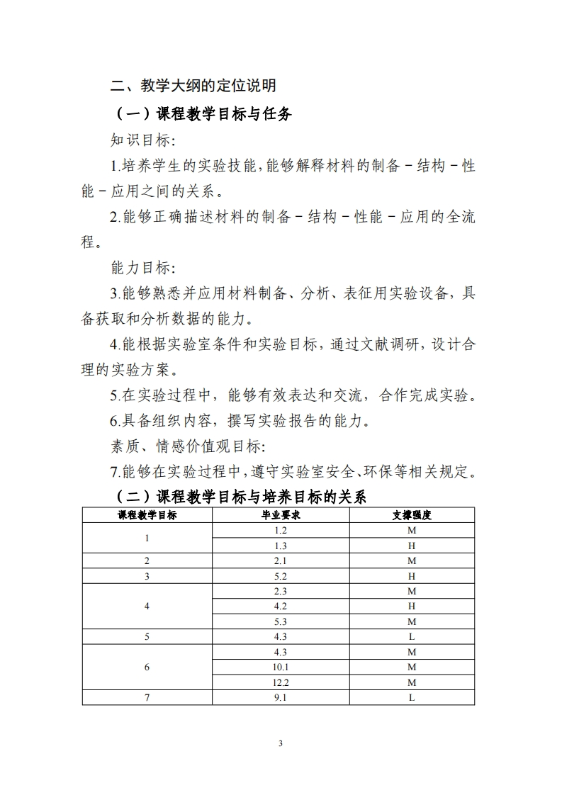 《材料化学综合实验》课程教学大纲一、课程概况课程名称材料化学综合实验课程号206412019课程英文名称Comprehensive Experiment inMaterials Chemistry学时/学分108/3课程性质必修适用专业材料化学课程负责人张水合教学团队刘文晶选用散材及自编讲义参考书目课程简介:材料科学综合实验涉及合成制备、结构分析、性能表征与应用等方面的材料研究的全流程。通过本课程的学习,验证和深化专业理论课程的内容,培养学生的实验技能,帮助学生深入理解材料的制备一结构一性能一应用之间的关系,了解材料研究的全流程,培养学生的实际动手以及分析和解决问题的能力。课程目标Course Objectives,CO)培养学生的实验技能,能够解释材料的制备一结构一性能一应用之知识目标(C01)间的关系。能够正确描述材料的制备一结构一性能一应用的全流程,以及实验设备的局限性。能够熟悉并应用材料制备、分析、表征用实验设备,具备获取和分析数据的能力。能根据实验室条件和实验目标,通过文献调研,设计合理的实验方能力目标(C02)案。在实验过程中,能够有效表达和交流,合作完成实验。具备组织内容,撰写实验报告的能力。能够在实验过程中,遵守实验室安全、环保等相关规定。素质、情感价值观目标(CO3)☑PM1讲授法教学36学时25%口M2研讨式学习学时%散学方式(Pedagogical口PM3案例教学学时%口PM4翻转课堂学时%Methods.PM)口PM5混合式教学学时%☑PM6体验式学习108学时75%考考核方式oEM1课程作业%口EM2单元测试%DEMB课堂舞论%(Evaluation课Methods.EM)选DEM4期中考试%oEM5期末考试oooEM6撰写论文/%实验报告