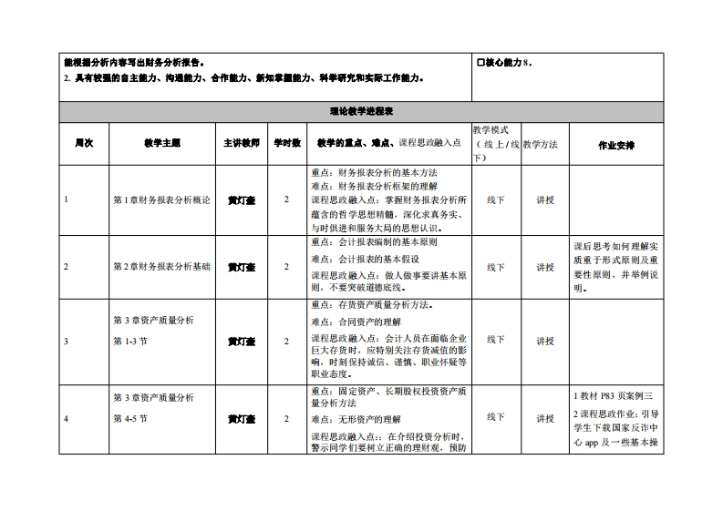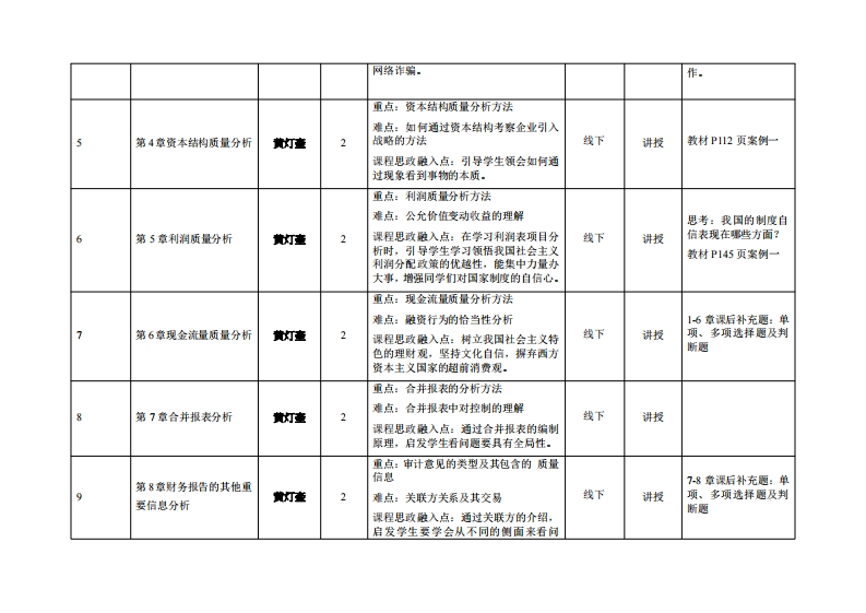 《财务报表分析》教学大纲课程名称:财务报表分新析课程类别(必修选修):选修课程英文名称:financial statement analysis总学时周学时/学分:32/22其中实验实驶学时:8先修课程:会计学原理、中鞭时务会计授裸时间:期二(34节)(第116周)授裸地点,粤台产业科技学陕实305授课对◆:2023级经济与查融专业1班开课学院:粤台产业科技学陕任课妆师姓名/风称:黄灯灯查副款授答时间、地点与方式:1、建立微信课程稀,实施线上答疑:2、每次上课的课前、课间和课后进行答疑:3、教师动公室答疑。课程考方武:开卷()闭港《)课程论文()其它《/)案例报告、实度报告使用数村:财务报表分析(第6版张新民钱囊民偏着)中☐人民大学出版社数学◆考资料:《财务报表分析(第6版张新民鳄漫民轴请)》案例分析与学习指导裸程简介:《附务报表分析》裸程是我陕经济与金败专业的一门专业选修裸程,本裸程的物色在于:竖决据弃传统的就会计论会计、就报表论报表的讲授方法,充分考虑传统时务比率分析存在的局限性,采用战略视角下的财务报表分析帽架,在管理系统中对企业财务状况及其质量进行分析与练合评价。学完本门课程,学生将树立正确的效丝观、正确的资产圆量现、资本结构质量观、利润质量现、现金流量质量现、附务状况蓝件的质量观等。课程敏华目标本课程与拳生核心能力培养之闻的关联(授课一、知识目标:对象为理工科专业学生的课程填写此烂):1通过本裸程的学习,使学生能够全面深入地掌量对务报表分析的知识,具有较强的附务报表分折能力:⊙核心能力1.2能够根据用户的信息要求,结合实际情况,进行对务报表分析工作,毕业后能够很快适应财务报表分⊙核心能力2.析工作的需要。⊙核心能力3.二、能力目标⊙核心能力4.具有较强的话言与文字表达、人际构通、信息获取以及分析和解决财务报表实际问愿的著本能力。⊙核心能力5三、素质目标:口核心能力6.1.、量汇贯通综合财务分析的特点、类型,能运用缘合财务分析的方法,如沃尔评分法、杜邦分析法,口核心能力7.