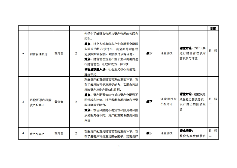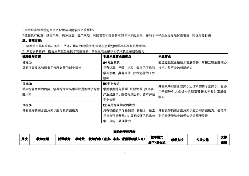《财富管理专题》教学大纲课斑名称,财言管理专加课忍类别(必修选修)事选修课程英文名称:Wealth Management Seminar总学时周学时学分,16V1其中实险实液学时,0先继课是:财务管理、金融市场、投资学后续课程支撑个人理财授课时间:2-9周星期三3-4节授课地点:实314视课对律:21额经济与金微系一、二在开裸学陕:粤合产业荆妆学陕任课柳姓名淋:黄灯奎倒教授邱油华饼师答展时间、地点与方式:实验楼212室课狸考楼方式:开卷()闭卷()课程论文()其它()使用妆村,《财言管温:道论与实液》,杨云,局行能展肌等:机械工业出版社20219/1妆学事考资料:财经杂志案例分析课避情介:财富管理专题课程是一门涉及财务规划、投资策略、风险管理等多个方面的综合性课程。该课程台在帮助学生全面了解财富管理的核心原理和实践技能,提升个人或机构的财富管理水平和财富增值能力。课程的目标是帮助学生掌握财富管理的核心知识和技能,使他们能够更好地规划个人或家庭的财务,实现财富的长期增值。通过该课程的学习,学生可以提升自己的财富管理水平,为未来的财富增值和传承打下坚实的基础课程教学目标及对毕业要求指标点的支排:一、知识目标:1使学生能够了解财富管理规划的基本概念和理论。2掌握资产配置与组合管理;以实现资产的多元化和分散化。降低投资风险。二、能力目标