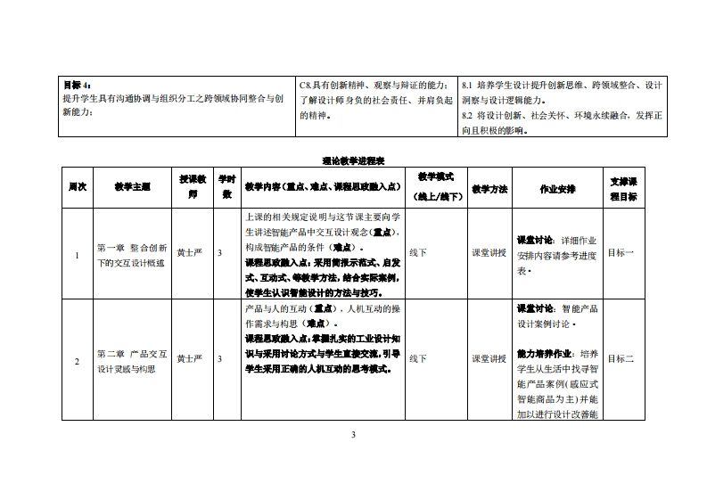 《跨领域设计》教学大纲课容名称:時顺城设计谋容类别(必修选修):专业必修课课是英文名称:Interdisciplinary Design总举时周学时学分:48/3G其中实验实瘦学时:32先修课强设计家推、机就制图与计算机端助工业设计后续课程文排年专测设计、单业设计授课时间:周四13节(1-16周授课地点:实验楼406提课对像:2022服工业设计开课学院:粤台产业科技学佛任课就闻姓名职淋:黄士严就授答凝时间、地点与方式:实202/周二34节课程考核方式:开卷()闭春()课程论文()其它(W)使用数材:《整合创新动下的帽能产品交互设计方法与应用来例,张凯王萍撒艺格着,中口仿飘出版社有限公司,2022年09月SBN:9787518084432数学套考责料:《细桃产品设计》,普本出酸有限公司着,电于工业出酸社,2020年8月算2服SBN:9787121321559课没简介:本课程以设计思考、从素焦实体产品交互设计,从产品功能、应用技术、使用场录、交互方式、外爽形式五个方面讲解了未来智能产品的整合创新设计路径,推荐了多种交互设计灵感与构思方法,通过智能交互产品设计全流程来例晨示如有将该方法进行应用。响应工业设计学科聘城投计整合创新的需求,对工业设计、产品设计人员及相关专业学生有一定◆考价值。
