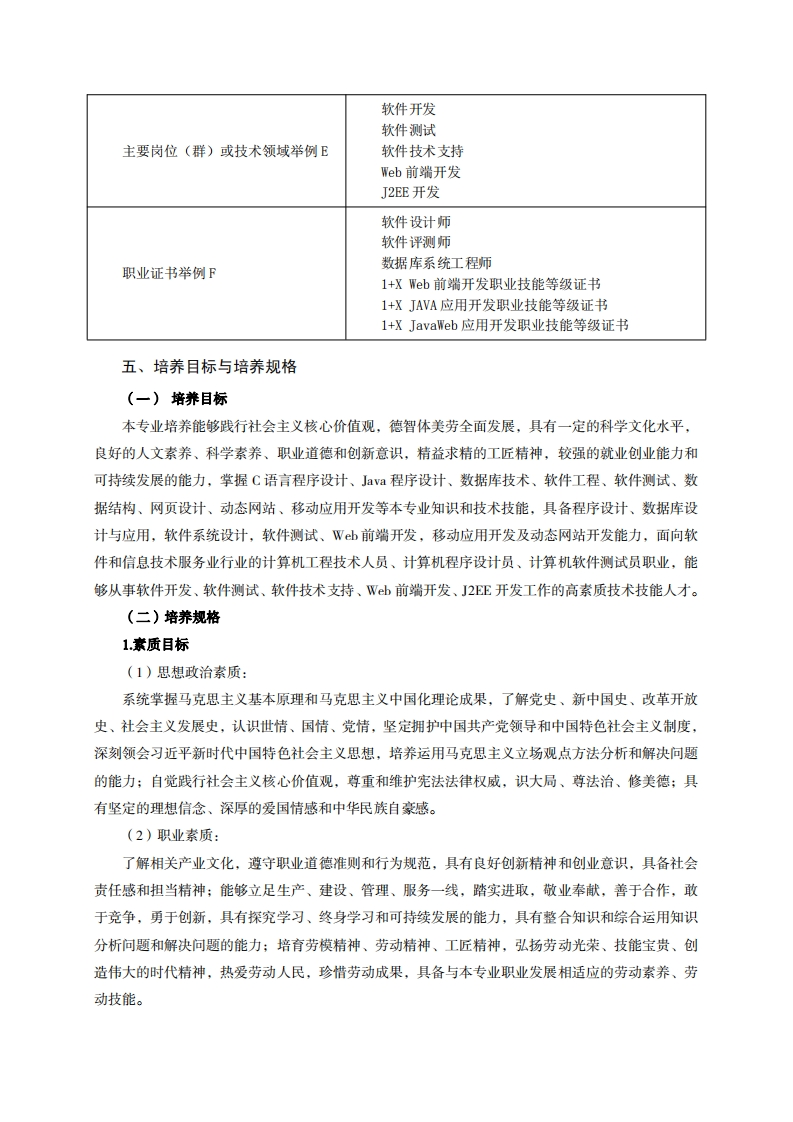 《软件技术》专业人才培养方案一、专业名称及代码专业名称:软件技术专业代码:510203二、入学要求招生对象:高中(中职)毕业生,或具有同等学力者。招生类型:文理兼收三、修业年限三年。四、职业面向(一)职业能力分析1.专业服务面向本专业学生的主要服务面向企事业单位,T行业,软件开发公司的软件技术服务、软件开发,软件测试,Wb前端开发,J2EE开发等岗位。2.职业岗位与职业能力分析序号工作岗位典型工作任务职业能力支撑课程1.软件开发与1.使用Java等编程语言编写程序应用数学、应用英测试语、C语言程序设2.编写测试计划、测试用例、执行测试、计、Java程序设计进行BUG验证及编写测试报告和对测试结2.系统架构与Python程序设计、程序设计果进行分析软件工程、软件测软件开发设计3.初步具备应用软件系统架构与设计能试、数据结构、UI软件测试力设计与制作、程序设4.具备项目需求分析及需求文档撰写的计综合实训、Java3.项目需求文能力开发综合实训、软件档撰写与软件测试综合实训、创新售后技术支持5.具有对软件产品应用、行业技术发展进行调研与分析能力创业课。1.具有网站设计与规划能力1.网页设计信息处理技术、网页2.掌握常用的网页设计软件的使用设计与制作、web前网页设计3.具有网站的维护能力端开发、Java Web2网站建设2.网站建设应用开发、图像处图像处理4.具有静态网页的设计能力理、计算网络基础、5.具有动态网页的设计能力Java Web开发综合3.图像处理6.熟练的使用图像软件处理网页素材实训。