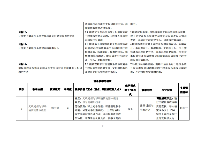 《遥控技术》教学大纲课程名称:量拉放术课程类别(必使选修):选修课英文名称,Remote Ca如trol Technology总学时周学时/学分:486/3其中实验实瘦学时:12先能课没:后续课座支堆授课时:3-17周星期三1-3节,7周星期四9-11节授课地点:实313裸对◆:智能制造1班开课学陕:粤台產聚科技孕院任裸妆师挺名骑:彭士荣/刷教授答是时间、地点与方式:裸避核方式:开卷()闭卷()课程论文()其它(鞭告)使用藏材,贺鹏飞、李晓林、吴世蛾、胡国英、阁较,《无线通信与移动通信技术(第2版)》,清华大学出版社妆学◆考资料:刘佳鲁、鲍敏,《电子产品原理与实践综合教程》,清华大学出版社课程情介:本课程是智能制造专业的专业选修课程,课程有系统并详细地介绍了无线通信和移动通信的基本概念和技术,以达到逼控的目的。课程内容包括无线通信与移动通信概论、无线通信基础、信道技术、数字调制解调技术、组网技术、移动通信系统与标准、手机原理。兼顾无线通信与移动通信的基本概念、基本原理、基本技术和主要系统。通过本课程的学习,学生应理解逼控所覆盖的知识骨景,掌挥逼控的体系结构,通晓逼控的关键技术,熟悉逼控的实际应用。最后透过实作项目,让学生在相关领域上,自行建构一个逼控设备的应用。课是目标及对毕业翼求州标点的支撑:课避被学目标支撑单业要求指标点毕业要求目标1:12能够将数学、自然科学、工程基础1能够运用数学、基础科学、计算机科学与技术等教学让学生了解逼控系统发展的社会肾景与技术肾景和人工智能技术的专业知识用于对复相关知识,对企业逼控系统开发运维问题具有解决