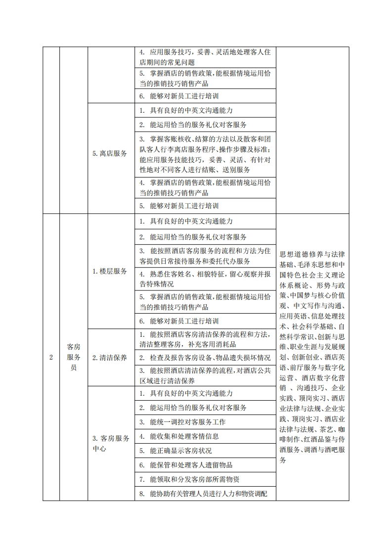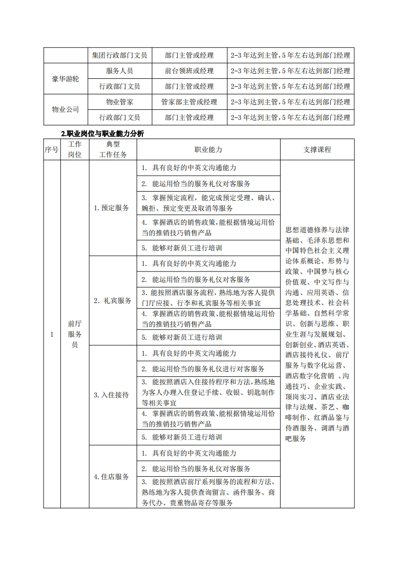 《酒店管理与数字化运营》专业人才培养方案一、专业名称及代码专业名称:酒店管理与数字化运营专业代码:540106二、入学要求招生对象:高中(中职)毕业生或具有同等学力者。招生类型:文理兼收。三、修业年限三年。四、职业面向(一)职业能力分析1.专业服务面向毕业生能充分胜任国内外高星级酒店、连锁酒店集团、高端餐饮公司、会议中心、精品民宿、豪华邮轮、物业管理公司等企业及其他相近服务类岗位旅游企业及其他相近服务类岗位。在获得一定工作经验后,2-3年能适应基层管理工作,5-8年能胜任中级管理及以上工作。专业服务面向分析表就业职业工作岗位领域初始岗位发展岗位群升职中层管理岗位的平均获得时间前厅部服务员前厅部主管或经理2-3年达到主管,5年左右达到部门经理客房部文职人员、客房部主管或经理2-3年达到主管,5年左右达到部门经理服务员高星级商务酒店、高级餐饮部文职人员、服务员餐饮部主管或经理2-3年达到主管,5年左右达到部门经理度假酒店调酒员、侍酒师酒吧领班、主管或经理2-3年达到主管,5年左右达到部门经理销售部营销员或其销售部或其他部门行2-3年达到主管,5年左右达到部门经理他部门行政人员政部门主管或经理高档餐饮连餐厅服务员餐厅领班或经理2-3年达到主管,5年左右达到部门经理锁企业行政部门文员部门主管或经理2-3年达到主管,5年左右达到部门经理服务人员前台领班或经理2-3年达到主管,5年左右达到部门经理会议中心行政部门文员部门主管或经理2-3年达到主管,5年左右达到部门经理精品民宿民宿管家店长2-3年升店长