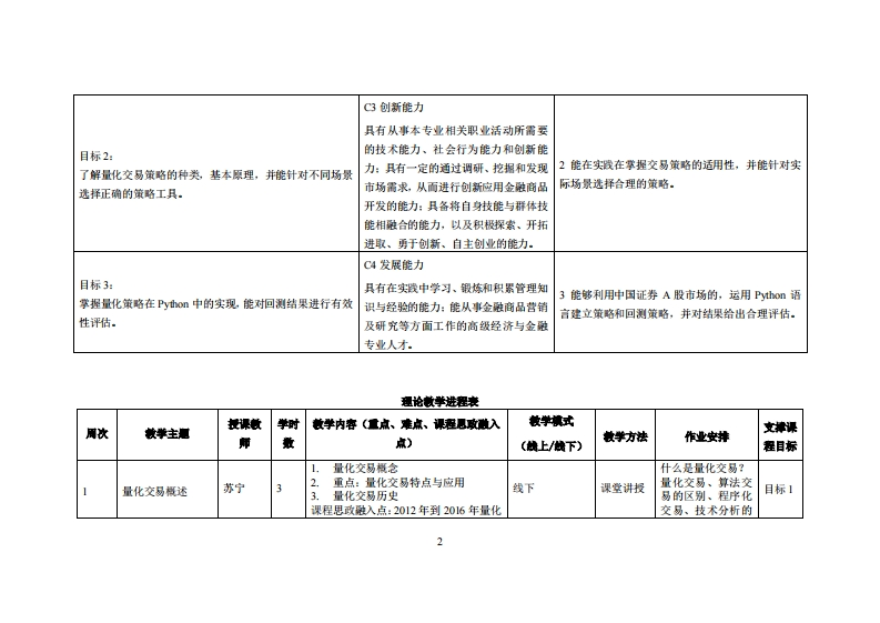 《量化交易策略》教学大纲课避名称:量化交易策略课和类别(必修选修)多专业选修课课程英文名称:Quantitative trading s本ategy总学时周学时学分,4833其中实检实减学时,24先继课是:程序设计I,程序设计Ⅱ,金融项目开发1后续课程支撑智慧金融漫课时间:2-17周周三第11节授课地点:莞城校区机电楼303提课对津:2020经济与金融1班(粤台金融科技)开裸学桃:粤台产业科技学院任课装师姓名淋:苏宁工程师鞭时间、地点与方式:217周、微信稀课是考恢方式:开卷()闭卷()课程论文()其它(√)塞例设计(文津与代码)使用微村Pyon量化交易:策略、技巧与实战课程简介:本课程着先介绍量化交易的盖础知识,即量化交需的定义、特点、应用、故事、历史等:再讲解量化交需平台J血Qat豪宽量化交易平台的功能、账户的注册和盘录、量化交易暗的创建、选股技巧、买卖条件模型、风险控树技巧,以及回测、模拟交高、实查交易:最后讲界Py山阳量化交易集培的机善算法运用技巧、因子分析起用技巧及量化交侧集略实战案例。课程妆学目标及对毕业要求州标点的支排:C2,C3,C4课程妆学目标支津单业要求指标点业要求C②运用专业知识的能力:具有良好的目标1:1能部署Python开发环境,正确加载和调用NumPy,综合应用知识能力和实践能力,能把学了解量化交易所需的最新江具pandas、Matplotlib库进行程序编写.到的经济学和金融学知识运用于实践。