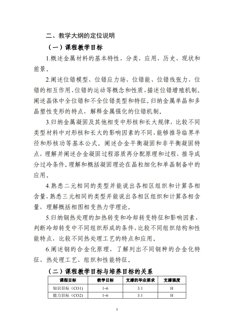 《金属材料》课程教学大纲一、课程概况课程名称金属材料课程号1412095课程英文名称Metal Material学时/学分36/2课程性质选修适用专业材料化学专业课程负责人张旭东教学团队徐远丽、彭鹏选用救材及《金属学与热处理》崔忠圻等主编,哈尔滨工业大学出版社:《材料科学基础》胡赓参考书目祥、蔡荀等主编,上海交通大学出版:《材料科学基础》,潘金生等编,清华大学出版社:《金属材料学》吴承建陈国良强文江等编著,治金工业出版社。课程简介:本课程是对材料学中与金属材料相关的基础理论和应用技术的较深入和全面地介绍。课程包括金属学和金属材料两大部分。其中金属学部分作为对《材料科学基础》(《材料科学与工程导论》教材)课程的补充内容,着重介绍有关位错理论、凝固理论、相变和相图(含三元相图)、材料热力学、热处理原理等内容。金属材料部分主要介绍金属材料合金化的一般规律及钢的合金化原理、分类和性能特点和应用等。课程目标(Course Objectives,,CO)掌握位错理论、金属凝固理论、相变和相图(含三元相图)、材料热力学、热处理原理等基础理论知识知识目标(C01)掌握金属材料的合金化原理和材料性能特征及优化原理熟悉金属材料在工程应用中的基本知识具有材料设计和研究的基本理论素养能力目标(C02)掌握材料性能和缺陷的分析研究方法了解金属材料的工程加工和应用学习专业知识的同时获得对金属材料重要性的认识以及对专业与职素质、情感价值观目标(C03)业的认识与认同能在设计开发解决方案的过程中,运用材料科学基础理论、工程管理与经济决策方法☑PM1讲授法教学27学时%☑PM2研讨式学习3学时%教学方式(Pedagogical☑PMB案例教学6学时%口PM4翻转课堂学时%Methods.PM)口PM5混合式教学学时%口M6体验式学习学时%考核方式考☑EM1课程作业25%oEM2单元测试%☑EM3课堂辩论25%(Evaluation试