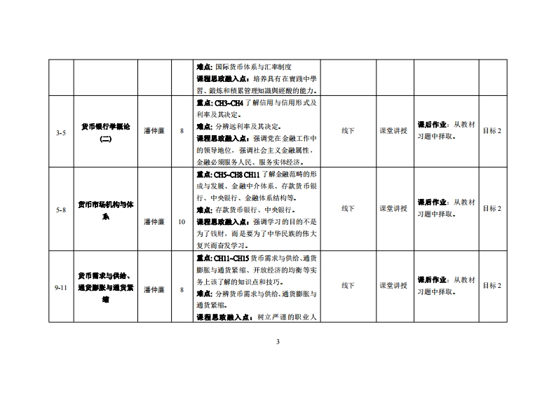 《金融学》教学大纲裸程名称:金融学课程类别(必修选修),选修课程英文名称:Money and Bankir吧总学时周学时/学分,483/3其中实险实戒学时:0先课是:撒观经济学、老观经济学、货币银行举、公司金融、会计学后块课程支撑:财言管理专愿授课时间:1-16周周一1-3节提课地点:实315提课对津:23金融1、2班开课学洗:粤台产业科技学陕任课收即姓名职淋:潘仲廉/副教授答鞭时间、地点与方式:周三34节,实307,188141023161.课堂:每次上课的课前、课间和课后进行答疑:2.线上:建立微信课程群,实施线上答疑。课程考核方式:开卷()闭卷()课程论文()实践报告()使用做材:《金融学》【货币银行学】黄达、张杰主编(第6版)、中国人民出版社2024年3月教学参考资料:《货币银行学》,易纲,吴有吕着,格致出版社2014年1月课程简介:《货币银行学》是金融专业选修的核心课程。是国内金融学科领域的经典课程,其初创伴随新中国金融学科之肇建,随后顺应改革开放以来金融学科的新发展,助力中国教师实现“在中国大学讲台讲述中国金融故事”之愿望。如今,面对纷繁复杂的全球经济金融变局,本课程致力于进一步提升中国金融学科建设水平。本课程熔金融学基本原理和中国货币金融实践于一炉,合理整合微观金融和宏观金融,形成系统完整的逻辑框架和知识体系,培养学生的货币银行学素养和分析解决实际问题的能力:课程数学目标及对毕业要求指标点的支排: