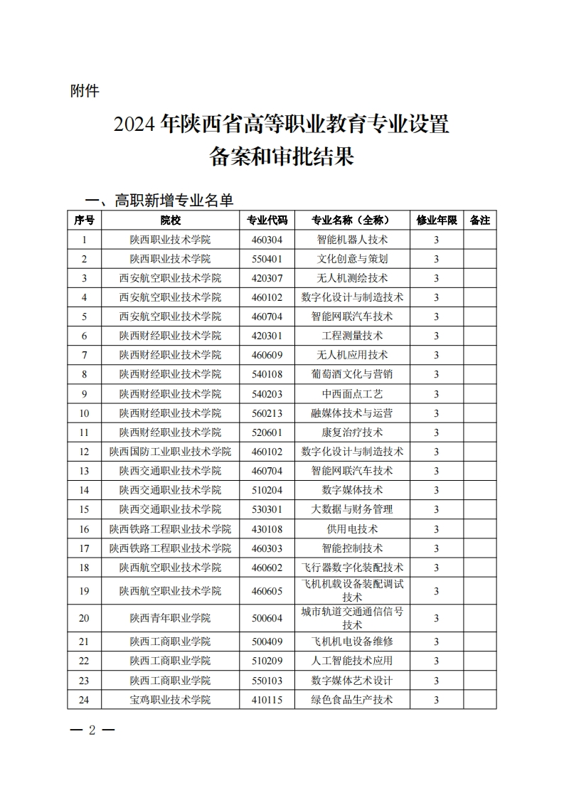 陕西省教育厅陕教函〔2024〕261号陕西省教育厅关于公布2024年高等职业教育专业设置备案和审批结果的通知各有关高校:根据《陕西省教育厅办公室关于做好2024年职业教育拟招生专业设置管理工作的通知》(陕教职办〔2023〕47号),结合教育部职成司要求,现将《2024年陕西省高等职业教育专业设置备案和审批结果》(见附件)印发你们。请据此安排招生工作,加强对新设专业的建设与管理,确保人才培养质量。省超西含线育反2024年3月99(不予公开)
