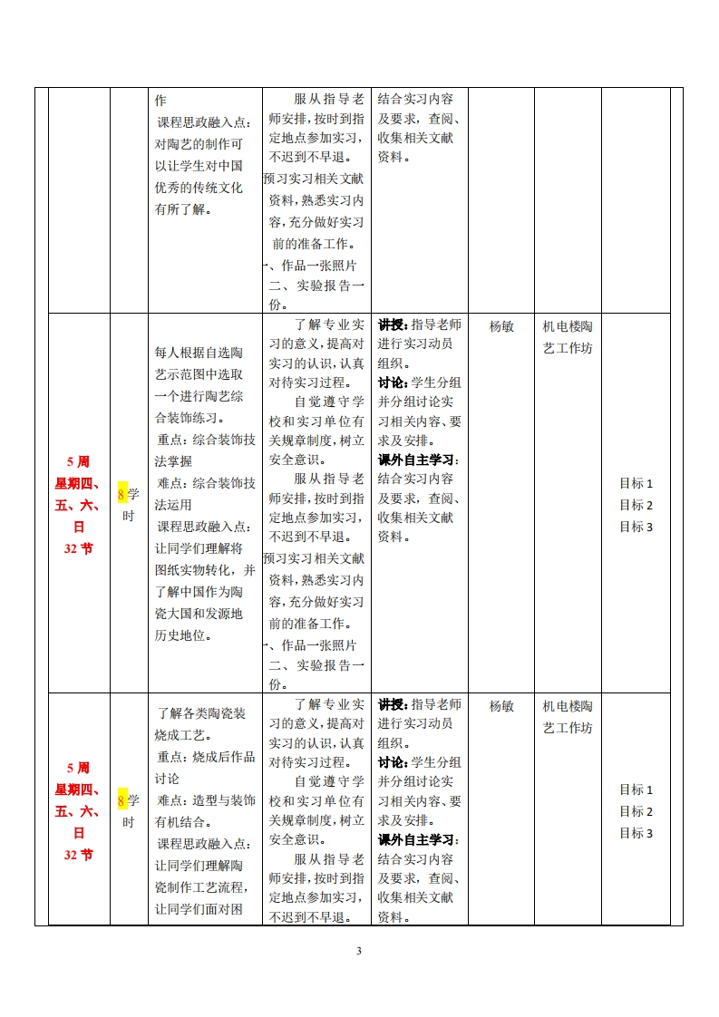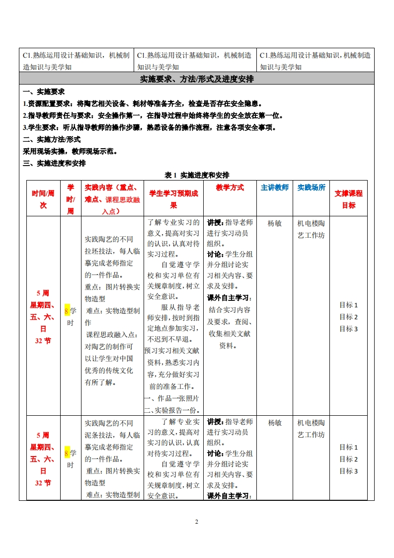 《陶艺设计(一)》教学大纲课程名称:陶艺设计(一)实践类别:口实习口实训口课程设计课程英文名称:Ceramic art(one)周数/学分:322/2授课对象:2022级工业设计1班(粤台)开课学院:粤台学院开课地点:☑校内(机电楼陶艺工作坊)任课教师姓名/职称:杨敏/正高级工艺美术师教材、指导书:陶艺技法、黄焕义等、江西美术出版社教学参考资料:考核方式:实操、作品提交答疑时间、地点与方式:周五下午/艺术实训中心面对面答疑课程简介:陶艺设计专业的一门重要的专业课程。通过本门课程的学习,使学生加强陶艺材料、制作工艺、技法上的应用力。通过本门课程了解世界陶瓷史中工艺技法上的演变,分析当代陶艺创作方式,探索陶艺的新表现形式,达到让学生独立思考并结合当代艺术现象进行陶艺创作的目的。陶艺课程沟通了陶艺与陶瓷设计两个课程,陶艺的手工制作性和陶艺材质的探索给陶瓷设计带来更为宽广的设计理念,陶艺在材质语言上的探索也能给产业化生产的日用陶瓷的设计带来更多的新鲜设计元素。陶艺课程的手工性和陶艺语言的多变性对培养陶瓷艺术设计专业学生驾驭的陶艺语言能力,为后续的专业课程奠定了较为扎实的基础。从更广的专业范围来看,陶艺课程可以培养学生的创造性思维能力。学生通过学习该课程后,能够熟练掌握陶艺的制作技法,独立创作陶艺。课程散学目标及对毕业要求指标点的支撑通过本门课程的学习,培养学生在材料和技法上的创新能力,使学生明确陶瓷工艺探索与发展的意义。通过本门课程了解陶艺与相关艺术门类的关系和陶艺在当代文化建设的价值,掌握陶艺与其它材料艺术形式结合的方法和陶艺新的表现形式,达到让学生独立创作完成和陶艺专业人员必须具备的重要基本素质。通过本课程的学习,要求学生达到以下目标:1、陶艺在艺术史和当代文化建设中的价值,要求把握陶艺的特性与表现力和陶艺在当代文化中的作用与介入。2、世界陶瓷史中陶瓷成型工艺技法上的演变,要求了解并掌握陶瓷在不同时期成型工艺的原因、背景和特点。3、分析并整理当代陶艺创作方式,要求通过不同地区的艺术家作品对比研究并整理出现代陶艺制作技法。4、掌握陶瓷材料和制作工艺,要求发掘当代陶艺在材料和制作工艺上的创新点,通过不同技法的结合运用探究各自的材质表现语言,探索不同泥料和釉料配置以及烧成方式。5、掌握陶艺装饰技法,要求探析当代陶艺在装饰技法的运用特点,探索不同装饰方法对陶艺本体语言的影响。6、陶艺在工艺上突破与创新,要求进一步研究陶艺在工艺上开拓,创造出新的视觉语言。课程教学目标支撑华业要求指标点单业要求1、陶艺在艺术史和当代文化建设中1、陶艺在艺术史和当代文化建设中的1、陶艺在艺术史和当代文化建设中的价值,要求把握陶价值,要求把握陶的价值,要求把握陶艺的特性与表现力和陶艺在当代文艺的特性与表现力和陶艺在当代文化艺的特性与表现力和陶艺在当代文化中的作用与介入。中的作用与介入。化中的作用与介入。目标一:培养具有工业设计与产品目标一:培养具有工业设计与产品设目标一:培养具有工业设计与产品设计设计计知识技能的专业设计人才:知识技能的专业设计人才:知识技能的专业设计人才: