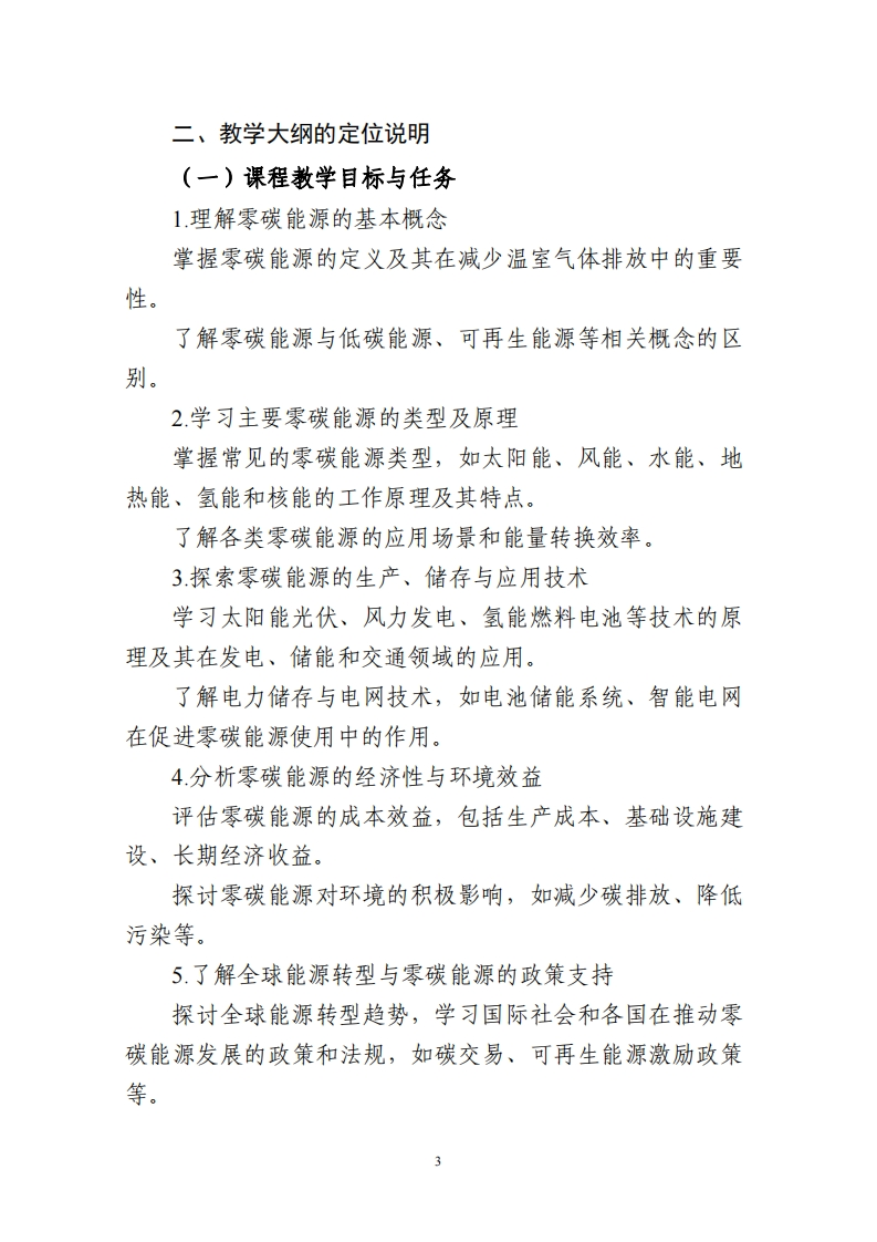 《零碳能源原理与技术》课程教学大纲一、课程概况课程名称零碳能源原理与技术课程号105412029课程英文名称Fundamentals of Zero-CarbonEnergy学时/学分36/2课程性质必修适用专业新能源材料与器件课程负责人祁菁教学团队刘奇明选用教材及参考书目课程简介:本课程是新能源材料与器件专业本科生必修的专业核心课。随着科学技术的发展,国家人才培养目标愈来愈强调产学研协同育人,该课程的主要内容为零碳能源的基础。主要介绍零碳能源的基本原理和技术,涵盖太阳能、风能、水电和核能等主要能源来源,以及能源存储等新兴技术。课程目标(Course Objectives,.CO)了解零碳能源概念知识目标(C01)掌握主要零碳能源类型学习零碳能源相关新兴技术具备分析和评估零碳能源技术的能力,理解其在实际应用中的操作和优化方法。能力目标(C02)通过实际案例和项目练习,培养解决零碳能源项目实际问题的能力,提出可行的解决方案。能够有效地与团队成员和利益相关者沟通,合作完成零碳能源项目,并清晰地展示和报告研究成果。增强学生对环境保护和可持续发展的意识,理解零碳能源在减少碳排放和应对气候变化中的重要性。激发学生的社会责任感,鼓励其在未来职业生涯中推动绿色能源和可持续发展。培养学生在零碳能源领域的创新思维,激励其探索和开发新的技术和解决方案。素质、情感价值观目标(CO3)增强学生对现有能源系统的批判性思考,培养其分析和解决能源问题的能力。通过团队项目和合作学习,培养学生的团队合作精神和沟通能力。拓展学生的国际视野,了解全球零碳能源发展的动态和趋势,理解各国在能源转型中的经验和教训。加强学生的职业素养,培养其在零碳能源领域的专业态度和道德规范。鼓励学生在零碳能源领域持续学习和自我提升,保持对新知识和新技术的好奇心和探索欲。教学方式(Pedagogical☑PM1讲授法教学学时30%☑PM2研讨式学习学时20%Methods,PM)