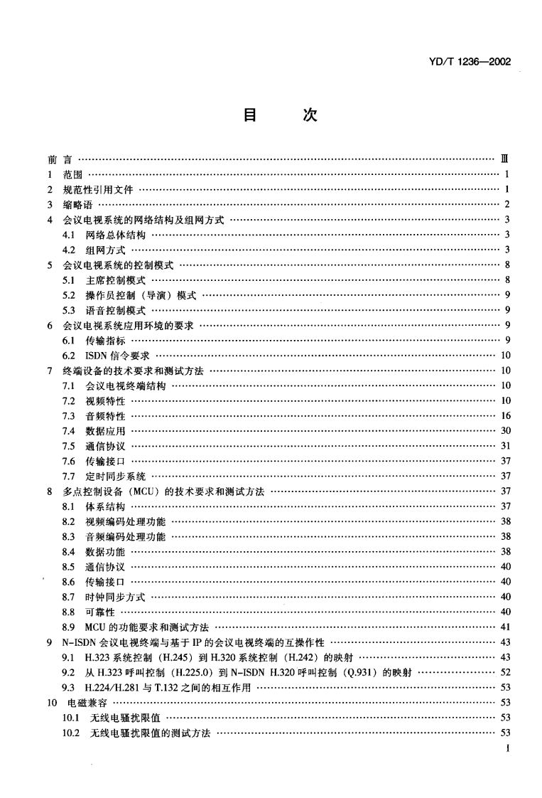 YD-T1236-2002348072@abc4个月前发布关注私信3.13MB105页034YD-T1236-2002此内容为付费资源,请付费后查看¥21¥31黄金会员免费钻石会员免费立即购买您当前未登录!建议登陆后购买,可保存购买订单付费资源 第1页 / 共105页 第2页 / 共105页 试读已结束,还剩103页,您可下载完整版后进行离线阅读 THE END标准规范 文本预览 1CS33.160.60M40YD中华人民共和国通信行业标准YD/T1236-2002N-ISDN会议电视进网技术要求及测试方法The technical requirement and test method for video conference systembased on N-ISDN2002-11-08发布2002-11-08实施中华人民共和国信息产业部发布 查看更多 收起部分 喜欢就支持一下吧收藏