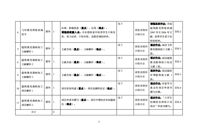 《项目化课程1》教学大纲裸应名称:项目化课程1课类别(必修选修),选修课程英文名称:Project Based Course 1总学时周学时学分,3222其中实检实减学时,24先修课程:高等款学、大学物理后续课程支排机械设计漫课时间:4至10周,周五,5-6节:11至16周,周五,5-7授课地点:粤台产业科技学院实验楼315节量课对律:2024级智能制造工程1、2班开裸学桃粤台产业科技学院任课效即姓名淋:谭华判副教授答票时间、地点与方式:课前、课间和课后:教室、办公室:网络、面授解疑。课程考恢方式:开卷()闭卷()课程论文()其它()使用微村应用光学,胡玉禧,中国科学技术大学出版社:妆学考资料:激光原理及应用(第4阪),陈家壁、彭润玲,电子工业出版社。裸庭情介:本课程围绕超快激光微纳加工技术展开,以飞秒激光焊接玻璃等先进加工技术为核心,结合理论学习与文献研究,培养学生对超快激光微纳加工的理解及科研能力。学生将通过小组合作围绕指定主愿进行研究,并提交学术报告作为期末考核。本课程强调科技报国精神,引导学生认识超快激光技术在国家高端制造业中的重要作用。课程数学目标及对毕业要求州标点的支排:裸程妆学目标支排单业要求推标点业要求目标1:掌握超快激光微纳咖工的基本原理和应用。1-】能够理解和应用光学及激光技术的基本理论,分析超快激光在微纳加工中的】工程知识应用。