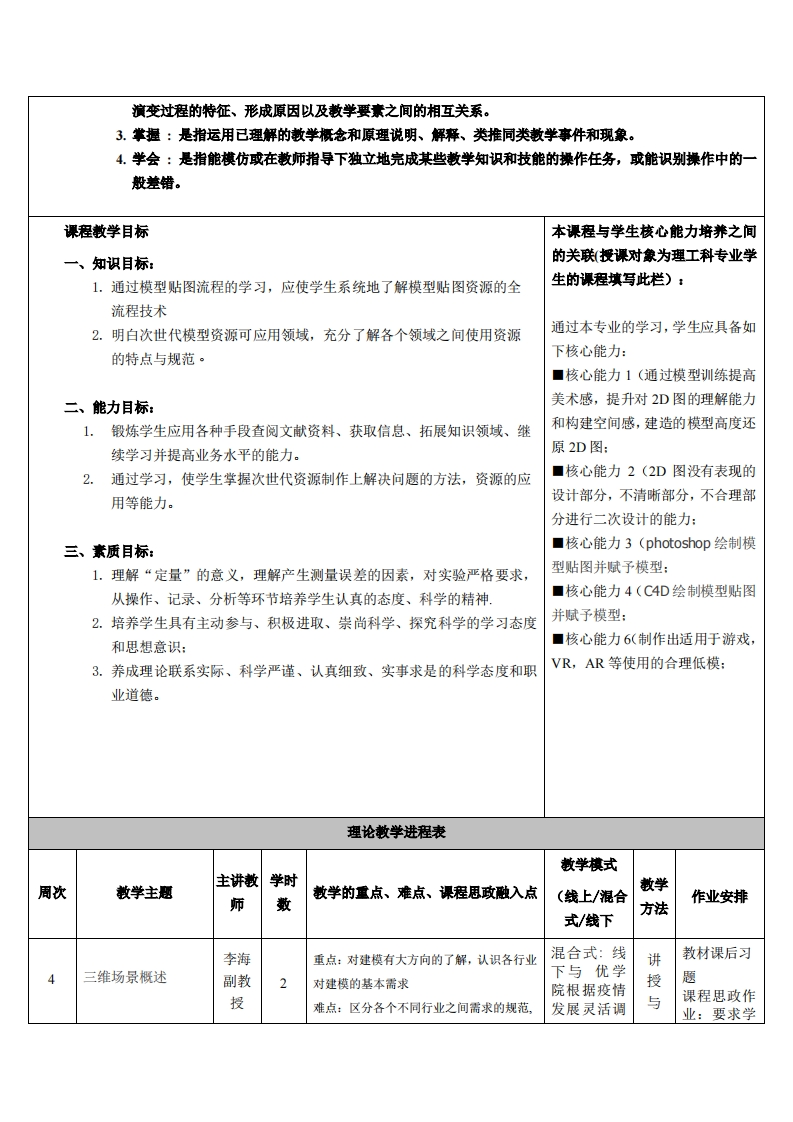 《项目化课程1》教学大纲课程类别(必修/选修):选课程名称:项目化课程1修课程英文名称:总学时/周学时/学分:32/2/2其中实验实贱学时:16/0先修课程:授课时间:4-19周星期二89节授课地点:实114机房授课对象:2022多媒体1班(粤台)开课学院:粤台产业科技学院任课教师姓名/职称:李海/副教授答乘时间、地点与方式:1.每次课的课前、课间和课后,采用一对一的问答方式:2.每次习题课,采用集中讲解方式课程考核方式:开卷()闭卷(√)课程论文()其它(√)使用教材:《三维场景设计与制作》清华大学出版社2017年1月,1SBN:9787302457169散学参考资料:1.《完美讲堂3 ds Max游戏美术设计与制作技法精讲》人民邮电出版社李梁等著2019年2月第1版2.《中文版Photoshop2020从入门到精通》水利水电出版杜瞿颖健编着2020年5月第1版课程概述1.课程重心是掌握游戏,动画,VR,AR,虚拟现实等的模型资源生产知识:游戏场景模型创建,可应用低模,UV展开,贴图绘制3.技能:自由应对不同项目需求制作出不同规格适合项目使用的模型资源以供项目使用。教学目标1.快速掌握3Dmx基础操作,建模相关编辑命令,流程使用知识点完成教学目标模型。2.三维场景的概念3.三维场景物件制作-战车。4.三维场景物件制作-囊法屋5.Photoshop结合UV绘制模型贴图并赋予到模型上,掌握贴图绘制的方法技巧。6.C4D直观的在模型上绘制手绘贴图。这门学科的知识与技能要求分为知道、理解、掌握、学会四个层次。这四个层次的一般通义表述如下:1.知道:是指对这门学科和教学现象的认知。2.理解:是指对这门学科涉及到的概念、原理、策略与技术的说明和解释,能提示所涉及到的散学现象