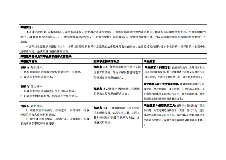 《项目化课程4》教学大纲裸避名称:项目化课程4课忍类别(必修选修)·任选修课程英文名称:Project-based curriculum4总学时周学时学分,3222其中实险实戒学时,24先修课塞:机械制图、项目化课程3后续课程支撑项目化课程5授课时间:周三56节,1-16周授裸地点:实315课对津:2022智能制造1班、2班开裸学洗:粤台产业科技学院任课放甲姓名琳:陈尚感/副教授答展时间、地点与方式:L,周五900-1200/实验楼412:2.每次习题课,采用集中讲解方式。课座考楼方式:开卷()闭港《)课程论文()其它(√)非试港类使用批村:肖苏华《机器视觉技术基础》(第1版)M北京:化学工业出版社,2021.敏学事考责料:孙学宏张文聪唐冬冬《机器视觉技术及应用》M北京:机械工业出版社,2021.刘秀平景军锋张凯兵.《工业机器视觉技术及应用》M)西安:西安电子科技大学出版社,2019.王颈期王康童遗杰责编:钟博《机器视觉技术与应用实战》M北京:北京理工大学,2023余文勇、石绘.《机器视觉自动检测技术》(第2版)[W.北京:化学工业出版社,2024.htps:Mwww.icourse163.org/course/HDU-l461554161中国大学MOOC(幕课)htps:ww.china-vi过on.org,(中国机器视觉网网)