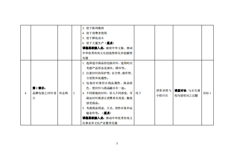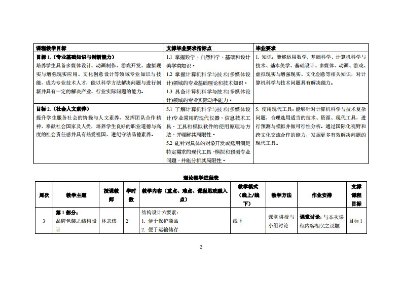 《项目化课程4》教学大纲课避名称,项目化课程4课和类别(必修选修)选修课程英文名称:Project Based Course4总学时周学时学分,322/2其中实检实液学时,24先继课是:数字图像处理与数字绘图、视觉传达设计后续课程支撑交互设计、作品集设计漫课时间:周三2-4节3-12周、34拘1313周授课地点:114机房提课对津:2022级多媒体设计开裸学陕:粤台产业科技学院多媒体设计系任课就甲姓名稀:林志炜/副教授答时间、地点与方式时间(课堂、课外)、地点(实验楼307、QQ)、方式(面谈、QQ)课程考核方式:开卷()闭卷()课程论文()其它()使用微村,《包装设计》,李娟、邓婧、梁黎、姚田编,清华大学出版社,2023年2月,1SBN:9787302623533妆学事考资料:课程物介:本课程各阶段相关理论讨论及各项实践作业都是采取小组团队的方式来进行,小组团队共同进行一系列实战,包含:拟定包装设计之主题、概念,并从中规划出最合适的品牌包装设计与品牌形象策略:接着绘制品牌包装设计之平面设计草图与立体设计草稿,然后再从平面设计草图与立体设计草稿中做出评估、汇整选择出好的包装设计方案:后续制作出实际尺寸的品碑包装设计立体模型,并从中加以评估、修政与调整,以确认包装设计的准确性、安全性与完整性之后开始制作、绘制正式版的包装设计稿件、图样绘制,并制作相关包装标签及包装设计印刷之包装展开图设计稿件,以进行最终的包装设计图稿整合:最后将包装设计稿件送至制作厂商进行包装印刷制作之前,再进行相关设计著作权、文字字体与设计图稿确认、印刷与颜色确认、设计软件兼容度等的校对工作,才能完成本课程的品碑包装设计作品。课程敏学目标及对毕业要求指标点的支排: