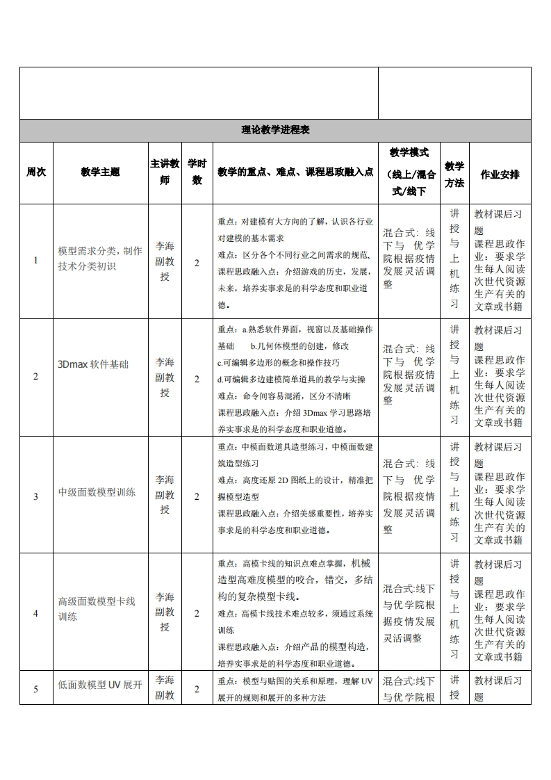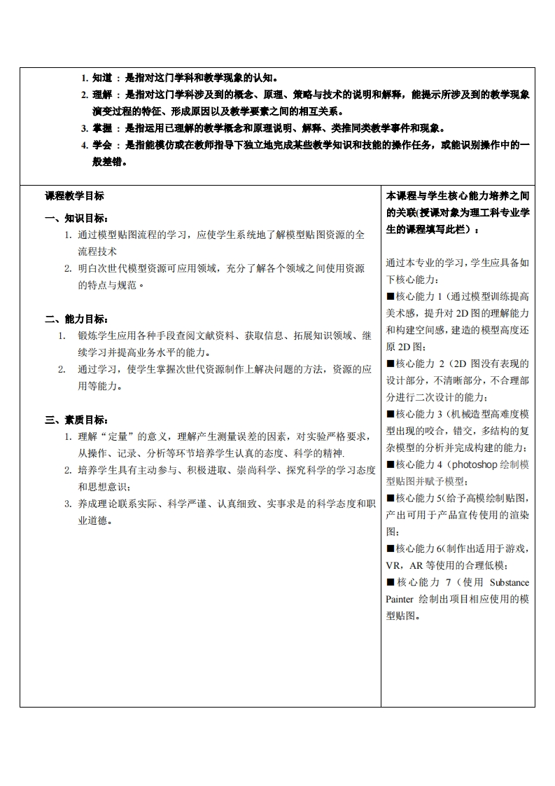《项目化课程4》教学大纲课程名称:项目化课程4课程类别(必修/选修):选徐课程英文名称:总学时/周学时/学分:32/2/2其中实验实贱学时:16/0先修课程:授课时间:4-19周星期二3-4节授课地点:实406机房授课对象:2021多媒体1班(粤台)开课学院:粤台产业科技学院任课教师姓名/职称:李海/副教授答乘时间、地点与方式:1.每次课的课前、课间和课后,采用一对一的问答方式:2.每次习题课,采用集中讲解方式课程考核方式:开卷()闭卷(√)课程论文()其它(√)使用散材:《次世代游戏机械及场景制作》清华大学出版社2015年8月,1SBN:9787302403753散学参考资料:1.《完美讲堂3dsMa游戏美术设计与制作技法精讲》人民邮电出版社李梁等著2019年2月第1版2.《中文版Photoshop2020从入门到精通》水利水电出版杜颖健编着2020年5月第1版课程概述1.课程重心是掌握游戏,动画,VR,AR,虚拟现实等的模型资源生产知识:高精度模型创建,可应用低模拓扑,UV展开,贴图绘制3.技能:自由应对不同项目需求制作出不同规格适合项目使用的模型资源以供项目使用。教学目标1.快速掌握3Dmax基础操作,建棋相关编辑命令,流程使用知识点完成教学目标模型。2.高模卡线基础散学,高模卡线的知识点难点掌握。3.机械造型高难度模型训练,通过各种咬合,错交,多结构的复杂模型训练达到精通各种造型的建模。4.模型与贴图的关系和原理,理解UV展开的规整和展开的多种方法。5.Photoshop结合UV绘制模型贴图并赋予到模型上,掌握贴图绘制的方法技巧。6.C4D直观的在模型上绘制手绘贴图。7.3Dmax制作可应用低模并进行UV展开8.精通Substance Painter绘制可应用模型贴图这门学科的知识与技能要求分为知道、理解、掌握、学会四个层次。这四个层次的一般酒义表述如下: