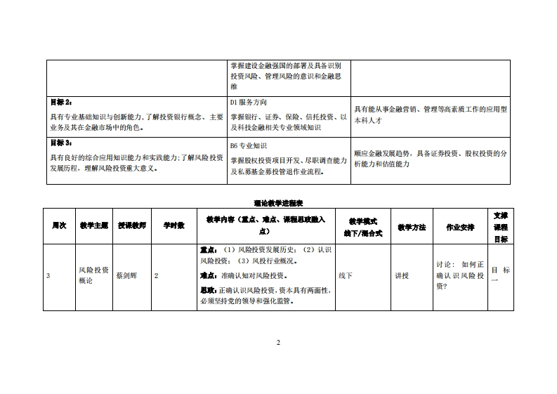 《项目化课程6》教学大纲课避名称,项目化课程6课和类别(必修/选修),选修课程英文名称:Project--based course6总学时/周学时/学分:32/16/2其中实检/实液学时,24先修课是:会计学、投资学后续课程支燥授课时间:3-12周星期一9-10节,13-16周星期一9-11节授裸地点:莞城实315/企业实地考察课对津:21级经济与金融1-2班开裸学洗:粤台科技产业学院任课就姓名/职称:蔡剑辉、邱瑞华答时间、地点与方式:1.课堂:每次上课的课前、课间和课后进行答疑:2.线上:建立微信课程册,实施线上答疑。课避考楼方式:开卷()闭卷()课程论文()■其它(根告)使用藏材:《私募股权投资》李俊峰,高等教育出版社被学◆考资料:万策资本私募股权投资理论和实务课狸情介:《私募股权投资》项目化课程是股权投资实战课程,是金融学专业理论与实践结合的进一步学习专业知识的基础。本课程主要学习风险投资、私募股权投资基金的理论、监管、实操。本课程藉由引企入教项目化课程进行,学习模式理论学习、讲座分享、项目实操相结合。课程妆学目标及对毕业要求洲标点的支排课程被学目标支撑单业要求指标点毕业要求目标1:热具有诚实守信的品德、廉洁自律的操守、知书识具有良好的职业道德和高度的社会责任感:树立金融报A1思想品德素质礼,具有奋斗精神、团队合作精神。国理想,具有勤奋、严谨、求真、务实的金融工作态度。