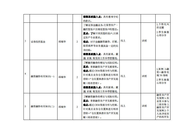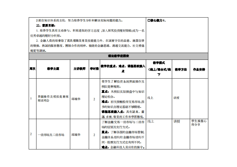 《项目化课程3》教学大纲课程名称:项目化课程3课程类别(必体选作):选推课英文名赫:Project-based course3总学时周学时学分:3222其中实险实玻学时,16先修课程:无菱裸时间:期二(晚上7点到九点)授课地点:线上使用同讯会议实验提305提课对橡:20及21领经济与全融系2班开裸学陕:粤合产业科技学洗任课敏师姓名职称:邱华讲师答疑时间、地点与方式:课程特核方式:开港()闭卷()课程论文()■其它(报告)使用微村:证券投责基盘管理筒阴数程王四淋主整,西安交漫大学出版社,2021,3出版藏学争考贵料:中信证券投资略实务分折课密情介:证券理财投资是一门有关如何进行投资的课程·是进入金难学专业进一步学习专业知识的基础·本课程主要学习投资基金·股票及衍生性难商品等相关項目化课程:并学习证券公司运营模式以及些管机制等·本课鼎藉由引企入教项目化程进行:以证券投资线上实务模拟大赛方式每周进行相关单元学习·课程敏学目标本课程与学生被心能力培养之间的关联授课一、知识目标:对像为理工科专业学生的课程填再此栏):1学生深刻理解证券投资公司的内在涵义,掌握证券投资公司各种投资组织形式的优口核心能力1.越性,也认识到它的局限性。口核心能力2.2学生能够把握证券投资的产生原因及发展历程,了解证券投资组织关系体系、资产口核心能力3.关系体系和市场关系体系,从而对证券投资形成总体上的认识,为之后的课程学习打下基口核心能力4础。口枝心能力5二、能力目标:口核心能力6.1.学会证券公司组织运作与管理之重要性.口核心能力7.