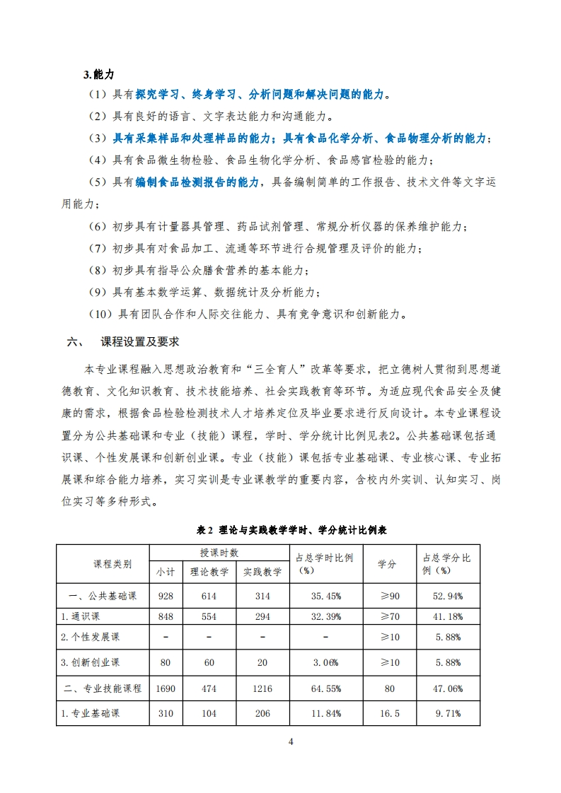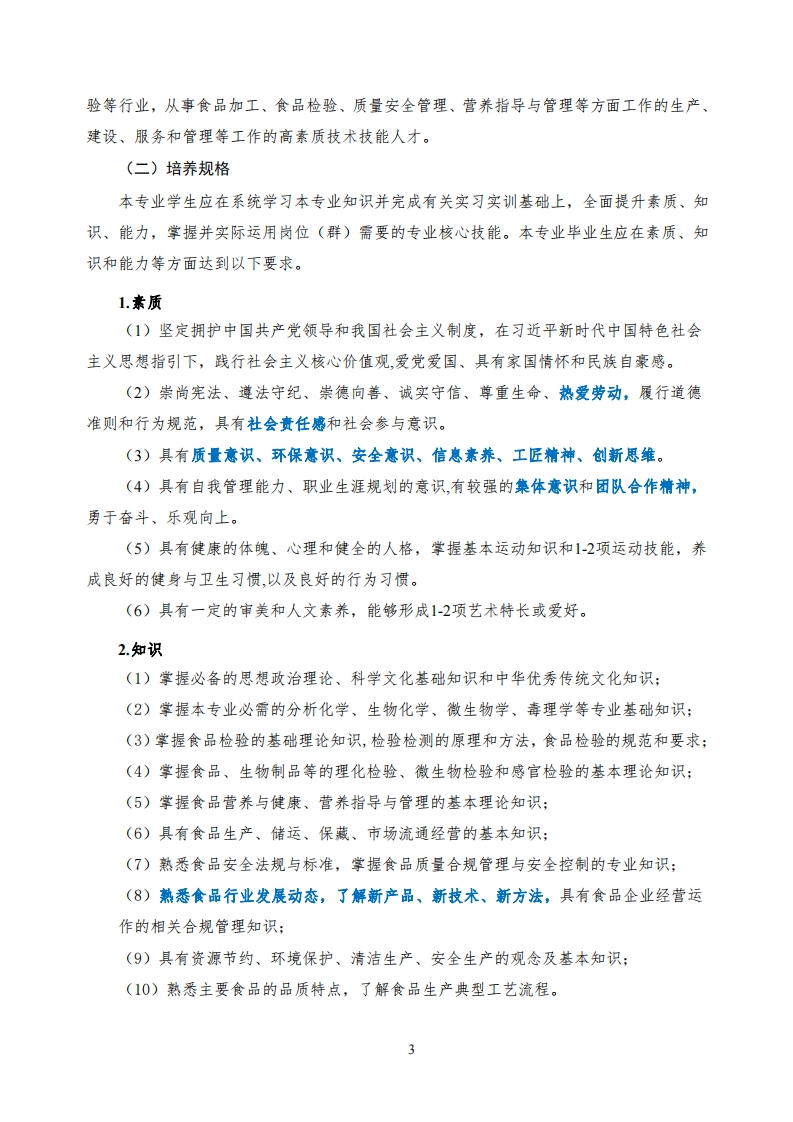 食品检验检测技术专业人才培养方案一、专业名称及代码食品检验检测技术(490104)。二、入学要求普通高级中学毕业、中等职业学校毕业或具备同等学力。三、修业年限三年。四、职业面向本专业的职业面向如表1所示。表1专业职业面向所属专所属对应行业主要职业类别主要岗位群职业资格证书业大类专业类或技术领域/职业技能等级证书(代码)(代码)(代码)(代码)乳制品加工人员乳品加工与乳品可食食品快速检测职(6-02-04);评鉴:业技能等级证书:食品药方便食品和罐头食品米面主食、冷冻食品与粮食品类食品制造食品合规管理职业技加工人员(6-02-03):品制作及罐头食食大类(4901)业(14)能等级证书:品加工;(49)焙烤食品制造人员(6-02-01)糕点面包烘焙与糕点装饰粮农食品安全评价职业技能等级证书五、培养目标与培养规格(一)培养目标本专业坚持立德树人,适应现代食品行业需求,培养能够践行社会主义核心价值观,德智体美劳全面发展,掌握扎实的科学文化基础和食品检验检测、食品质量安全控制、食品营养与卫生、食品加工工艺等专业知识和技术技能,具备食品检测、食品分析、食品安全控制、食品营养指导、食品运销等能力,具有良好的人文素养、科学素养、数字素养、创新意识、工匠精神、职业道德和较强的就业创业能力、可持续发展的能力,熟悉食品行业新技术、新材料、新工艺、新设备设施的管理和应用,面向食品生产、流通、销售、检2