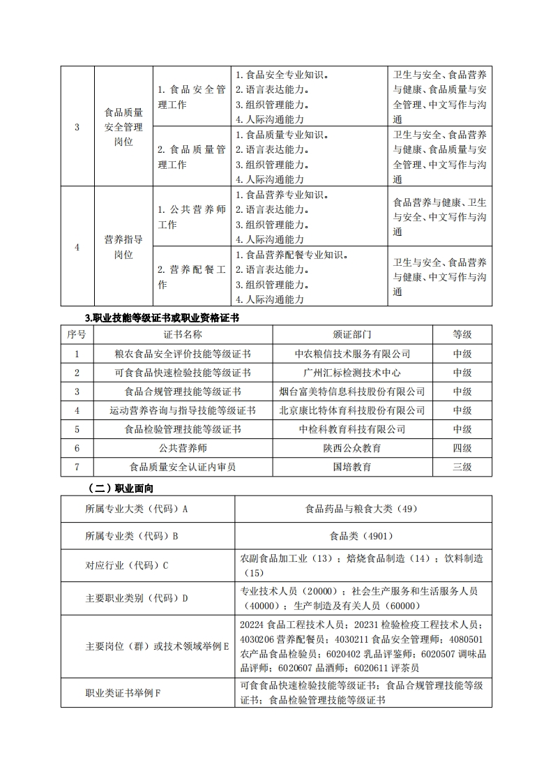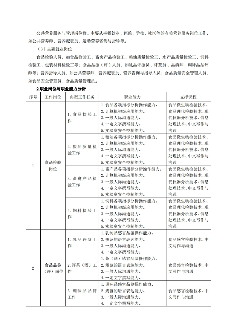 《食品检验检测技术》专业人才培养方案一、专业名称及代码专业名称:食品检验检测技术专业代码:490104二、入学要求招生对象:高中(中职)毕业生或具有同等学力者。招生类型:理科。三、修业年限三年。四、职业面向(一)职业能力分析1.专业服务面向(1)就业面向及工作岗位就业领域:食品安全管理领域;食品加工领域:食品流通领域;食品技术教学领域:食品技术研发领域。初始岗位:从事食品产业链质量控制与安全管理、食品检验、公共营养服务与管理等相关岗位的基础性工作。发展岗位:食品检验人员,如食品检验工(高级工)(1年~2年)、食品检验工(技师)(3年~5年);食品产业链“质量工程技术人员”,如质量工程师(初级)(1年~3年)、质量工程师(中级)(5年~8年)等:食品产业链“食品安全管理人员”,如食品安全师(助理)(1年~3年)、食品安全师(中级)(5年~8年);餐饮服务食品安全管理员(中级)(1年~2年)、餐饮服务食品安全管理员(高级)(3年~5年)等:中小型企业的“食品工程技术人员”,如技术员(1年~3年)、工程师(5年~8年);“管理工业)工程技术人员”,如车间主任(3年~5年)、部门主管(5年~8年)等。(2)主要工作岗位群食品检验岗位群。主要从事食品原辅料、半成品和成品检测工作,如食品检验工(包括可食食品快速检测)、畜禽产品检验工、粮油质量检验工、水产品质量检验员、包装材料检验工、动物饲料检验工等。食品质量安全管理岗位群。即主要从事食品产业链质量与安全控制管理的有关岗位,对应的工作岗位主要为:粮农食品安全性评价、食品质量管理员、食品安全合规管理员、餐饮服务食品安全管理员等。