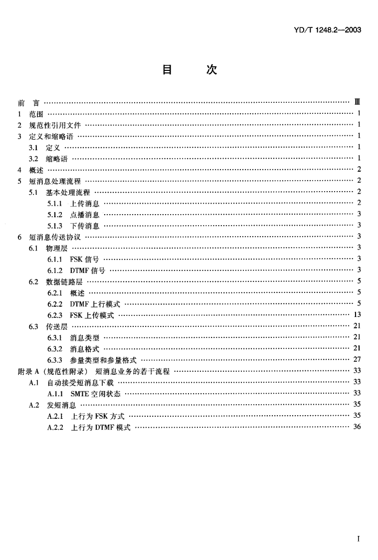 ICSYD中华人民共和国通信行业标准YD/T1248.2-2003固定电话网短消息业务第二部分短消息终端和短消息中心之间的传送协议技术要求Short Message Service Based on PSTNPart2:Technical Requirements of Transmission Protocol between ShortMessage Terminal Equipment and Center2003-01-22发布2003-01-22实施中华人民共和国信息产业部发布