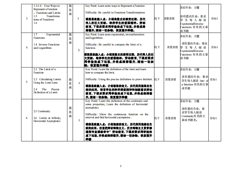 《高等数学》教学大纲课程名称:高等数学课程类别(必修选修):必修课程英文名称:Calculus总学时/周学时/学分:0/5/5其中实验实践学时:无先修课程:高中数学后续课程支撑:然性代数:振率论与数建统计:大学物理:电工电子技术授课时间:318周:每周三5-7节:周四1-2节授课地点:实验楼314授课对象:2024工业设计、经济与金1赛开课学院:粤台产业科技学院任课教师姓名/职称:周忠津测做授答疑时间、地点与方式:线下实数校306在线骨讯会议、徽信:非上课时段曾可。课程考核方式:开卷()闭卷()课程论文()其它()使用教材:Janes Sterart,Calculus,,7u Edition课程简介:高等数学是我校的一门重要基础理论的课程。通过本课程的学习,使学生系统地获得一元函数微积分的基本知识和理论:本课程重点学习函数、极限、导数、积分(不定积分、定积分)、微分方程,并注重培养学生熟练的运算能力和较强的抽象思维能力、逻辑推理能力,几何直观和空间想象能力,从而使学生学会利用基础数学知识去分析和解决一些工程,几何、力学和物理等方面的实际问题,为学习后续课程和进一步扩大数学知识莫定必要的数学基础。课程教学目标及对毕业要求指标点的支撑:课程教学目标支撑毕业要求指标点毕业要求目标1:1.1掌握数学、自然科学和工程基础类毕业要求1-工程知识:能够运用数学、基础科学具有智能制造专业知识与技能的工程技术人才:知识。和智能制造工程专业相关知识,对智能制造工程问题具有解缺能力。1