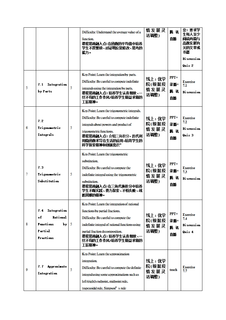 《高等数学》教学大纲课程名称:高等数学课程类别必修选修):必修课程英文名称:Calcul血s总学时月学时学分:80乃5其中实验实学时:无先多课程:高中数学技时间:设课地点:授裸对像:多媒琳&电商一年级本科生开课学院:台学粮任课教师斑名职粥:翁章译版答时间、地点与方式:课程考方式:随堂考(v)期中考《v)期味考《)出勘《)使用教村:James Stewart,,Calculus,,7 Edition..教学参考资料:高等数学,同济大学数学系,第七灰°课程消介:高等数学是高等学按洛专的—门重基课程,它是工程数学,统计机车,微粉几何等学科之基础应用层面也丰常广泛主要有工程科学、自然荆学社会科学、金学、医学等各个领城高教学裸程的学习,不仅为学生后维转业止课的学习打下必要的数学基纯而且还能进学生的抽峥思维和提高学生的推理能力,更能进一步地应用在自己专业城上生活实例上,是一门实用且应用广泛之数学基础必修课程。课程教学目标本课程与学生核心能力培养之间的一、知识目标:关联假裸对橡为理工科专业学生的1.利用积分去计两曲线所围碱之面职,圆庄体体积,圆体薄壳林积,课程填写出姥):函嫩之平均值,薰长所形成面和及其转之体积:核心能力1.应用数学、基础料学2.运用各种职分技巧法计算定积分和不定积分两种型式包变理变换法和修媒琳&电商专知识的能力。贝则,分部职分,三角函嫩替换法,有理式旺嫩之部盼分式分解:学习利佣近似口核心能力2.设计与执行实验以积分技巧法计算积分之近似值和积分等问题。及分折释数的能幼。二、能幼目标:】.学习利佣积分技巧解微分方程式包岳可份离式方程式和线牲方程式等了核心能力3.多煤琳&电商时所鼓能、技术以及使用软硬件工具的问题能力。2.学习运用参数方程式和极硅栋去表示曲线,并计算面忠、转体体积、口核心能动4.多媒琳&电商系统、长、曲线面职。部件或工艺程的设计能幼。三、素质目标:】.培养学生具有主动修与、积极进取、崇肖科学、究科学的学习疮度和口核心能幼5.项目管理、有效沟通思想意识;协调、团队合作及喻能力。2.养成理轮底系实际、科学乎谨、认真政、实事球是的蝌学态度和职业了核心能力6.发捉、分折与解缺复能杂多媒琳&电商问的能力。了核心能力7.认识科技发展织状与趋势,了解工程技术对环境、社会及全球的的,并培养持续学习的叼惯与能幼。