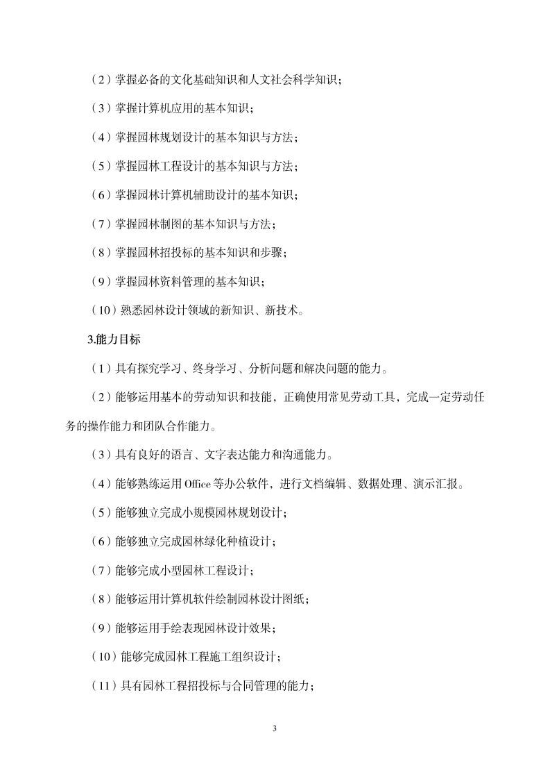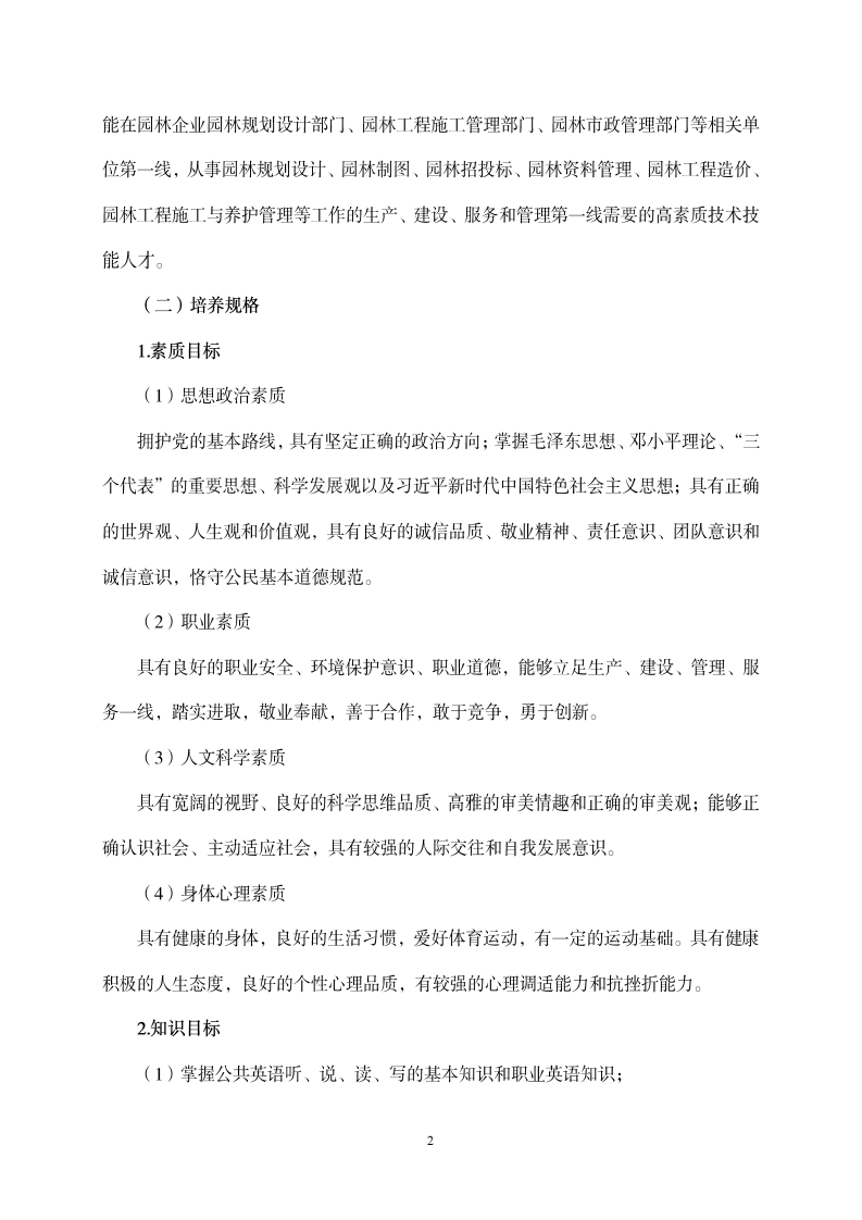高等职业技术教育2019级风景园林设计专业人才培养方案一、专业名称及代码专业名称:风景园林设计专业代码:540105二、入学要求高中阶段教育毕业生或具有同等学力者三、修业年限三年四、职业面向表1风景园林设计专业职业面向所属专所属对应职业技能等级证书、业大类专业类主要职业类别主要岗位类别行业行业企业标准和证(代码)(代(代码)(或技术领域)(代码)书举例码)1.景观设计师(行1.景观设计师:土木工程建筑工程技术人2.园林植物造景业)建筑设建筑业员(1-05-03)2.植物造景师(行土木建师:计类(69):林业工程技术人业)筑大类3.园林绘图员:(5401公共设施员(1-05-05)3.《城市园林工人技(54)4.园林工程施工管理业植物保护技术人术等级标准》员:(78)员(1-07-02)4.《园林景观工程相5.园林工程资料员关规范及标准》五、培养目标与培养规格(一)培养目标本专业培养德、智、体、美、劳全面发展,具有较高综合素质、良好职业道德、创新精神和创业意识,掌握园林规划设计、园林植物景观设计、计算机辅助设计等基本知识,具备园林规划设计与表现能力、园林工程设计与施工能力、园林植物景观设计能力,