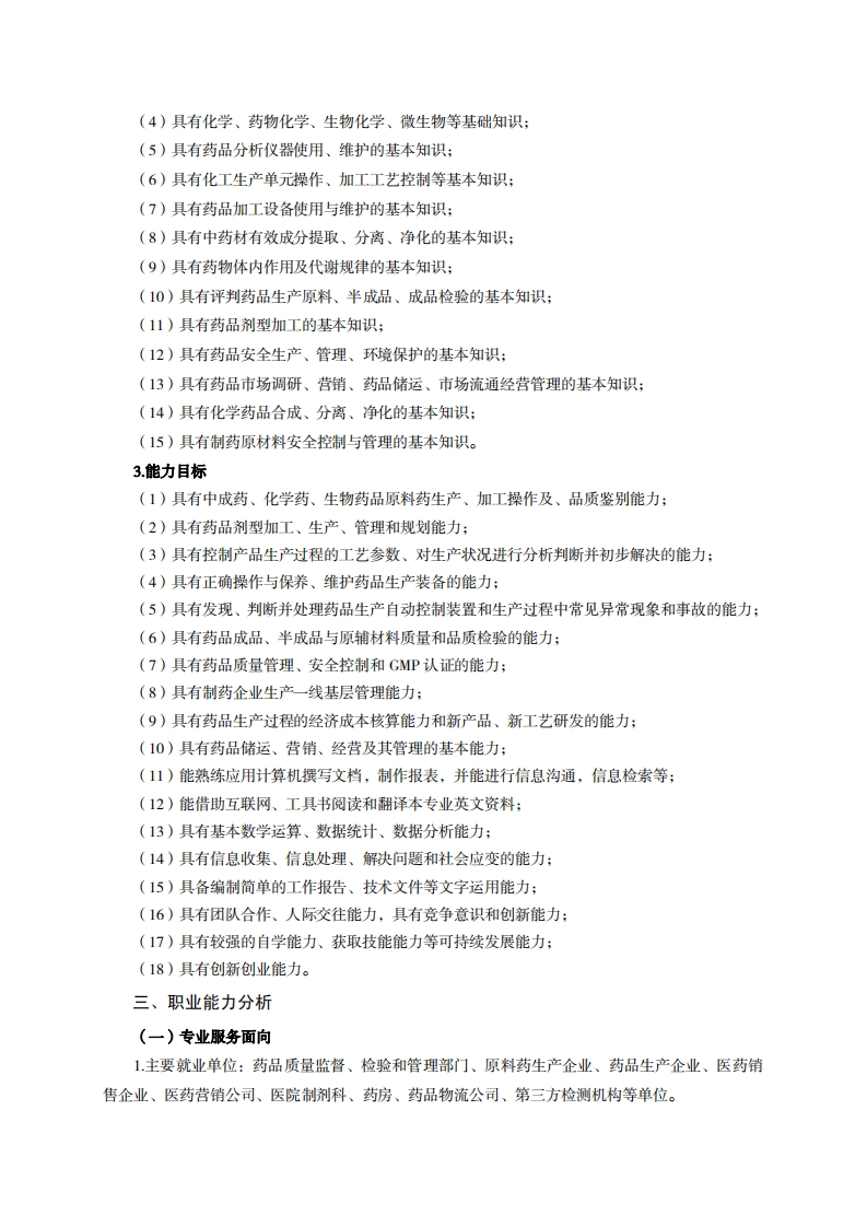 高等职业技术教育《药品生产技术》专业人才培养方案(普招三年制)专业代码:490201一、学制及招生对象(一)学制:三年。(二)招生对象:高中(中职)毕业生。(三)招生类型:文理兼收二、培养目标与人才规格(一)培养目标本专业培养德、智、体、美、劳全面发展,具有较高综合素质、良好职业道德、创新精神和创业意识,掌握药学基础知识、药品生产、管理与销售综合知识,具备制剂生产、原料药生产、药品质量监督与检验、药品行政管理、药品营销、制药工艺开发、药品售后服务等综合能力,在医药制造行业从事药品生产及管理、药品质量管理、药品营销、新药研发和推广、药品售后服务等工作,具有创新创业意识和一定创新创业能力的高素质技术技能人才。(二)人才规格1.素质目标(1)思想政治素质:系统掌握马克思主义基本原理和马克思主义中国化理论成果,了解党史、新中国史、改革开放史、社会主义发展史,认识世情、国情、党情,深刻领会习近平新时代中国特色社会主义思想,培养运用马克思主义立场观点方法分析和解决问题的能力;自觉践行社会主义核心价值观,尊重和维护宪法法律权威,识大局、尊法治、修美德:矢志不渝听党话跟党走,争做社会主义合格建设者和可靠接班人。(2)职业素质:具有良好的职业安全、环境保护意识、职业道德,创新精神、创业意识,能够立足生产、建设、管理、服务一线,踏实进取,敬业奉献,善于合作,敢于竞争,勇于创新。(3)人文科学素质:具有宽阔的视野、良好的科学思维品质、高雅的审美情趣和正确的审美观:能够正确认识社会、主动适应社会,有较强语言和文字表达能力,有较强的人际交往能力和自我发展能力。(4)身体心理素质:具有健康的身体,良好的生活习惯,爱好体育运动,有一定的运动基础。具有健康积极的人生态度,良好的个性心理品质,有较强的心理调适能力和抗挫折能力。2.知识目标(1)具有公共英语听、说、读、写基本知识和职业英语知识:(2)具有文化基础知识和人文社会科学知识:(3)具有计算机应用的基本知识: