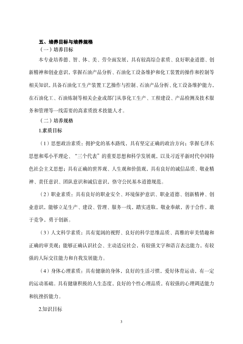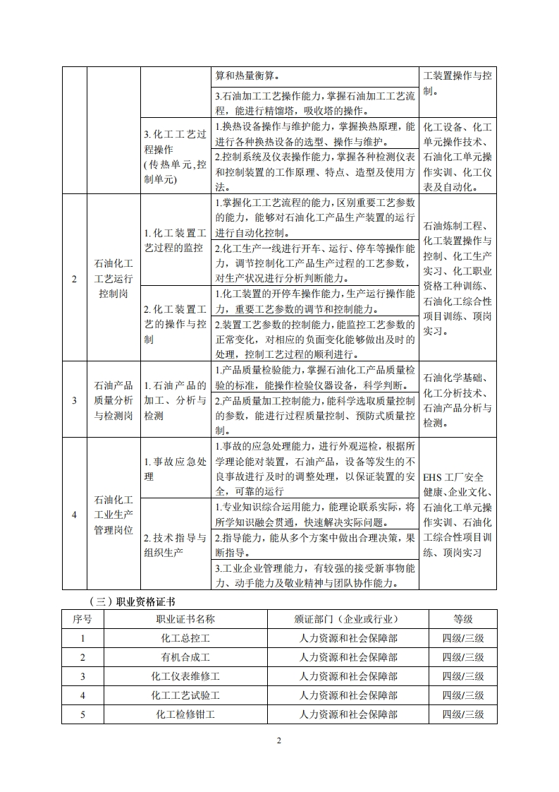 高等职业技术教育《石油化工技术》专业人才培养方案(普招三年制)2019级一、专业名称及代码(一)专业名称:石油化工技术(二)专业代码:570203二、入学要求(一)招生对象:高中(中职)毕业生(二)招生类型:文理兼收三、修业年限三年(全日制)四、职业面向(一)职业面向本专业主要面向石油化工生产装置操作、工艺运行、技术管理、生产建设及服务等一线工作。本专业主要就业单位有:炼油、化工、能源、环保等企业及部门。主要就业岗位:石油化工生产装置操作与维护岗、石油化工工艺运行控制岗、石油产品质量分析与检测岗、石油化工工业生产管理岗位。其它就业岗位:有机化工、煤化工产品生产岗位;化工产品分析检测、反应器操作与控制岗位;化工设备使用与维护等操作岗位;化工外操现场巡检、事故应急处理、技术指导与组织生产等生产管理岗位。(二)职业岗位与职业能力分析序号工作岗位典型工作任务职业能力支撑课程1化工管路阀门安装能力,能识图、会选型、能1.化工设备管安装。化工设备、路安装,化工设化工制图及2化工设备维护能力,能识图,能巡回检查,能石油化工备使用与维护AutoCAD.进行同步、协同检修。生产装置11反应设备操作能力,能进行釜式反应器、固化操作与维高分子化学、石2.化工工艺过护岗床反应器、流化床反应器、管式反应器的操作。油化学基础、化程操作(分离、2.有机化工工艺操作能力,掌握化工生产过程中工分析技术、物反应单元)的常用指标与催化剂,能进行催化氧化、催化理化学、化工单加氢、芳烃转化、羰基合成等的操作及物料衡元操作技术、化