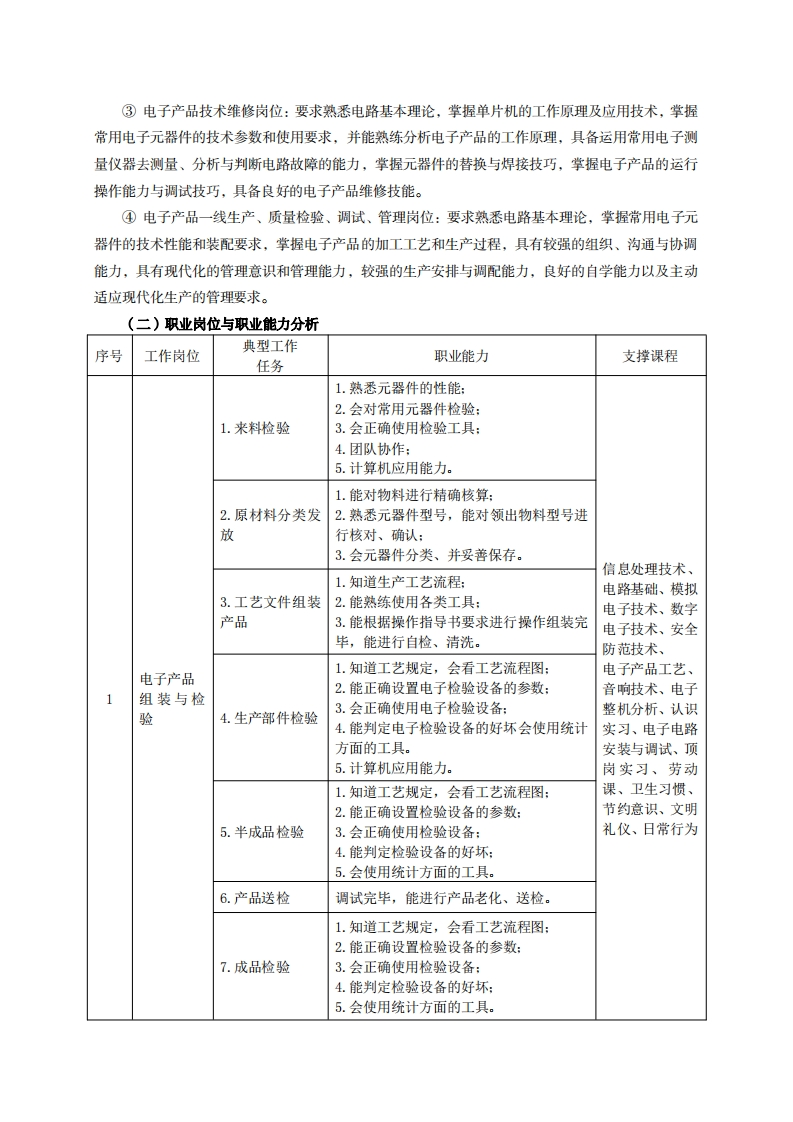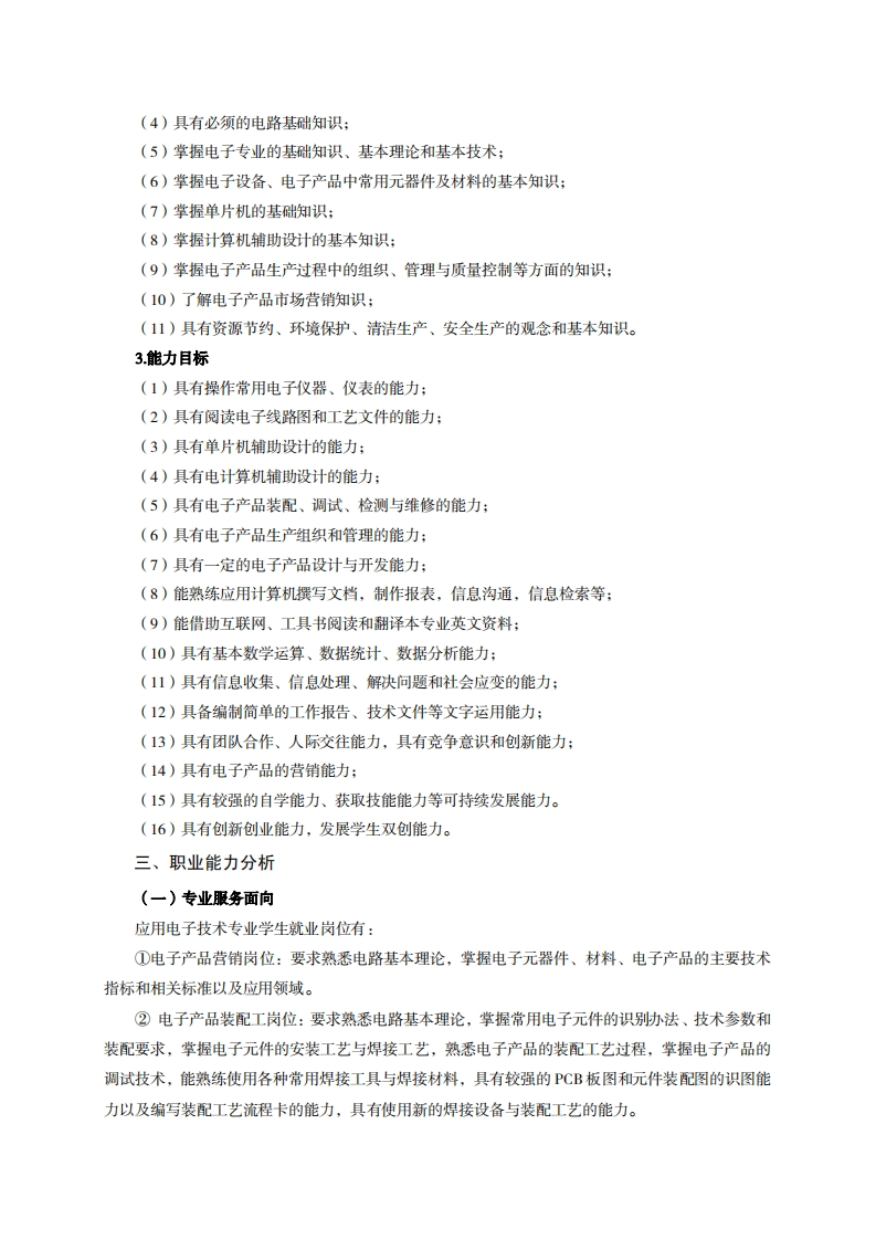 高等职业技术教育《应用电子技术》专业人才培养方案(普招三年制)专业代码:510103一、学制及招生对象(一)学制:三年。(二)招生对象:高中(中职)毕业生。(三)招生类型:文理兼收。二、培养目标与人才规格(一)培养目标本专业培养德、智、体、美、劳全面发展,具有较高综合素质、良好职业道德、创新精神和创业意识,掌握电路基础、模拟电子技术、数字电子技术、单片机技术、高频电子线路、现代电子设计与制作技术、电子产品生产工艺及管理、电子测量等知识,具备计算机辅助设计能力、单片机辅助开发与设计能力、电子产品的分析能力、常用电子仪器、工具使用能力,在电子行业(企业或岗位等)从事现代电子类工作的生产、建设、服务和管理第一线需要的高素质技术技能人才。(二)人才规格1.素质目标(1)思想政治素质:系统掌握马克思主义基本原理和马克思主义中国化理论成果,了解党史、新中国史、改革开放史、社会主义发展史,认识世情、国情、党情,深刻领会习近平新时代中国特色社会主义思想,培养运用马克思主义立场观点方法分析和解决问题的能力:自觉践行社会主义核心价值观,尊重和维护宪法法律权威,识大局、尊法治、修美德:矢志不渝听党话跟党走,争做社会主义合格建设者和可靠接班人。(2)职业素质:具有良好的职业安全、环境保护意识、职业道德、创新精神、创业意识,能够立足生产、建设、管理、服务一线,踏实进取,敬业奉献,善于合作,敢于竞争,勇于创新。(3)人文科学素质:具有宽阔的视野、良好的科学思维品质、高雅的审美情趣和正确的审美观:能够正确认识社会、主动适应社会,有较强文字和语言表达能力,有较强的人际交往能力和自我发展能力。(4)身体心理素质:具有健康的身体,良好的生活习惯,爱好体育运动,有一定的运动基础。具有健康积极的人生态度,良好的个性心理品质,有较强的心理调适能力和抗挫折能力。2知识目标(1)具有必须的公共英语听、说、读、写基本知识和职业英语知识:(2)具有必备的文化基础知识和人文社会科学知识:(3)具有计算机应用的基本知识: