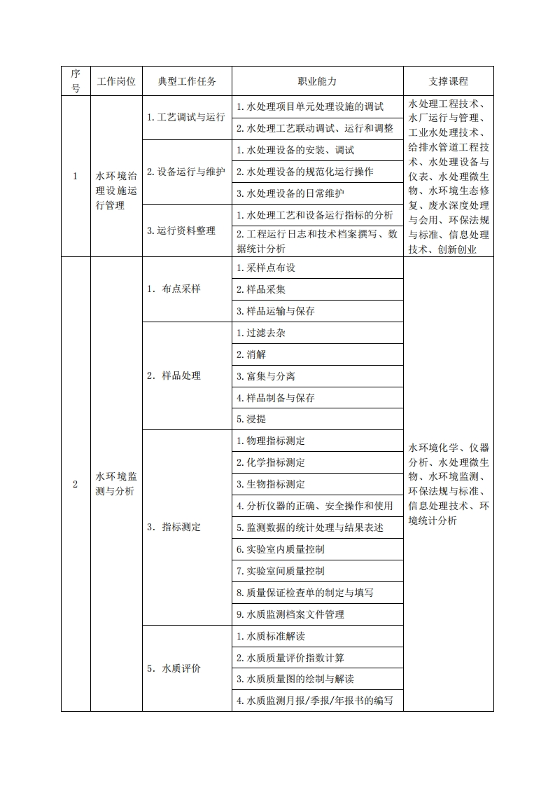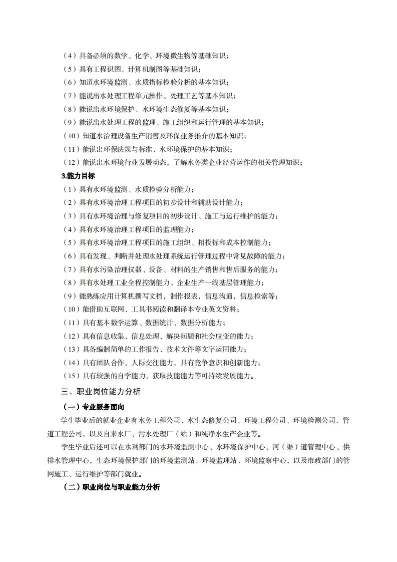 高等职业技术教育《水环境监测与治理》专业人才培养方案(普招三年制)专业代码:550402一、学制及招生对象(一)学制:三年。(二)招生对象:高中(中职毕业生。(三)招生类型理工二、培养目标与人才规格(一)培养目标本专业培养德、智、体、美、劳全面发展,具有较高综合素质、良好职业道德、创新精神和创业意识,掌握水资源利用、水环境保护、水生态修复等方面基本知识,具备监测与评价、治理与修复、运行与管理等方面能力,能在水务、水利、市政、环保等行业企业从事水环境监测、水污染治理、水生态修复和污水(自来水)运行管理等工作的生产、建设、服务和管理一线需要的高素质技术技能人才。(二)人才规格1.素质目标(1)思想政治素质:拥护党的基本路线,具有坚定正确的政治方向;掌握毛泽东思想、邓小平理论、“三个代表”的重要思想、科学发展观和习近平新时代中国特色社会主义思想:具有正确的世界观、人生观和价值观,具有良好的诚信品质、敬业精神、责任意识、团队意识和诚信意识,格守公民基本道德规范。(2)职业素质:具有良好的职业安全、环境保护意识、职业道德,创新精神、创业意识,能够立足生产、建设、管理、服务一线,踏实进取,敬业奉献,善于合作,敢于竞争,勇于创新。(3)人文科学素质:具有宽阔的视野、良好的科学思维品质、高雅的审美情趣和正确的审美观:能够正确认识社会、主动适应社会,有较强文字和语言表达能力,有较强的人际交往能力和自我发展能力。(4)身体心理素质:具有健康的身体,良好的生活习惯,爱好体育运动,有一定的运动基础。具有健康积极的人生态度,良好的个性心理品质,有较强的心理调适能力和抗挫折能力。2.知识目标(1)具备必须的公共英语听、说、读、写基本知识和职业英语知识;(2)具备必备的文化基础知识和人文社会科学知识:(3)具备计算机应用的基本知识: