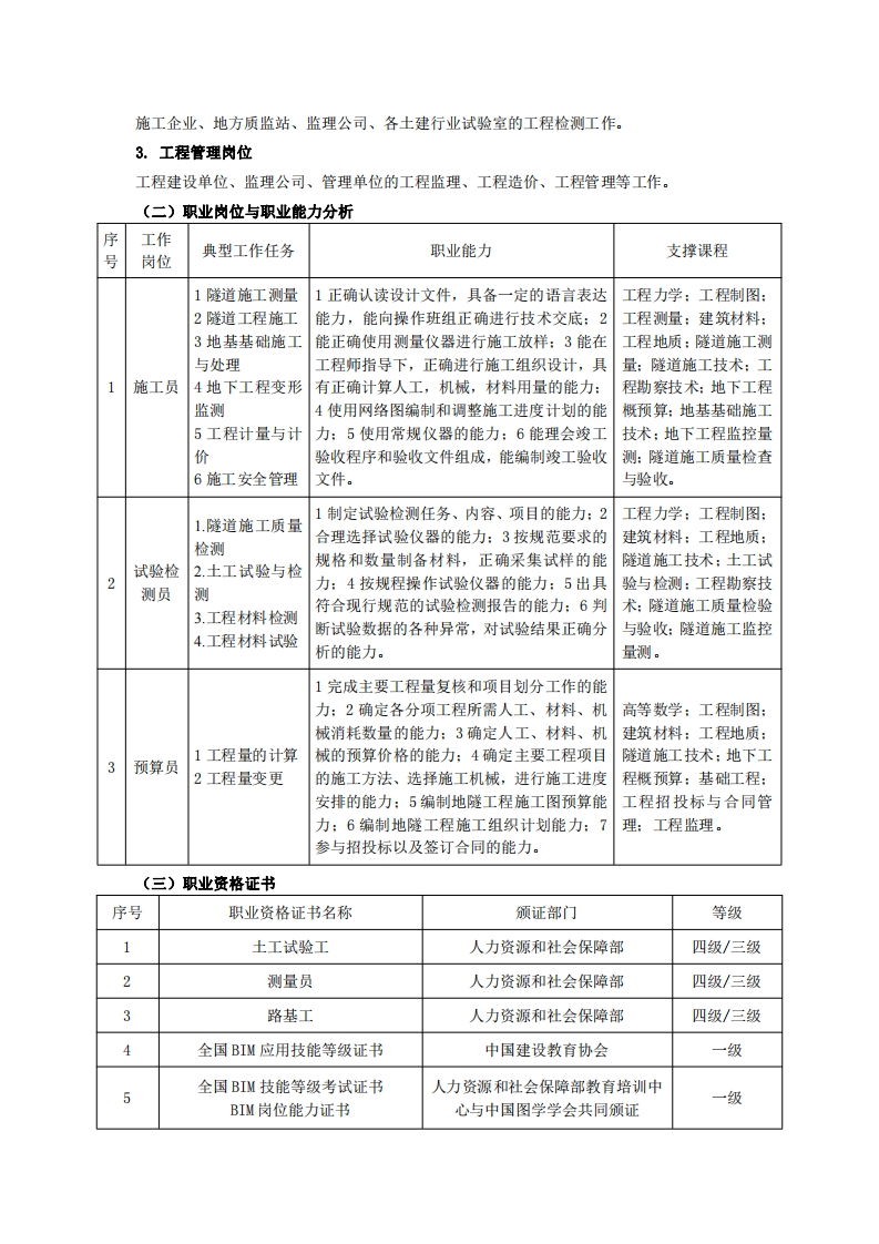 高等职业技术教育《地下与隧道工程技术》专业人才培养方案(普招三年制)专业代码:560302一、学制及招生对象(一)学制:三年。(二)招生对象:高中(中职)毕业生。(三)招生类型:理科。二、培养目标与人才规格(一)培养目标本专业培养“德、智、体”全面发展,具有较高综合素质、良好职业道德、创新精神和创业意识,掌握地下与隧道工程的施工及维护专业知识,具备施工现场技术指导、土工及建材试验检测、监控量测及质量检测等能力,在水利水电、道路交通、工民建等行业,从事地下与隧道工程施工、试验检测、资料整理等工作的生产、建设、服务和管理第一线需要的高素质技术技能人才。(二)人才规格1.素质目标(1)思想政治素质:拥护党的基本路线,具有坚定正确的政治方向:掌握毛泽东思想和邓小平理论以及“三个代表”的重要思想和科学发展观:具有正确的世界观、人生观和价值观,具有良好的诚信品质、敬业精神、责任意识、团队意识和诚信意识,格守公民基本道德规范。(2)职业素质:具有良好的职业安全、环境保护意识、职业道德、创新精神、创业意识,能够立足生产、建设、管理、服务一线,踏实进取,敬业奉献,善于合作,敢于竞争,勇于创新。(3)人文科学素质:具有宽阔的视野、良好的科学思维品质、高雅的审美情趣和正确的审美观:能够正确认识社会、主动适应社会,有较强文字和语言表达能力,有较强的人际交往能力和自我发展能力。(4)身体心理素质:具有健康的身体,良好的生活习惯,爱好体育运动,有一定的运动基础。具有健康积极的人生态度,良好的个性心理品质,有较强的心理调适能力和抗挫折能力。2.知识目标(1)具有思想道德修养和法律基础等知识:(2)具有必须的公共英语听、说、读、写基本知识和职业英语知识:(3)具有必备的文化基础知识和人文社会科学知识:(4)具有计算机应用的基本知识:(⑤)具有施工场地测绘、施工放样及测绘资料整理等的工程测量基本理论知识: