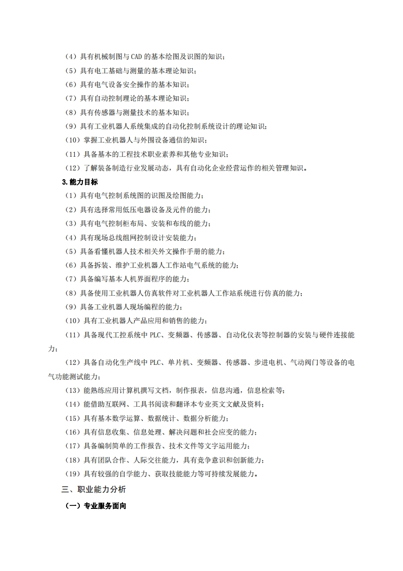 高等职业技术教育《工业机器人技术》专业人才培养方案(普招三年制)专业代码:560309一、学制及招生对象(一)学制:三年。(二)招生对象:高中(中职)毕业生。(三)招生类型:理科。二、培养目标与人才规格(一)培养目标本专业培养德、智、体全面发展,具有较高综合素质、良好职业道德、创新精神和创业意识,掌握电气设备及自动化装备制造及生产线所需的理论知识,具备自动化生产线安装、检修与运行管理、工业机器人系统集成、程序设计、安装调试维护、产品销售和技术服务能力,在各大中型自动化生产、研发企业、从事自动化成套装备中工业机器人工作站的现场编程、调试维护、人机界面编程、系统集成等生产技术管理工作,以及工业机器人销售和售后服务等一线需要的高素质技术技能人才。(二)人才规格1.素质目标(1)思想政治素质:拥护党的基本路线,具有坚定正确的政治方向:掌握毛泽东思想和邓小平理论以及“三个代表”的重要思想和科学发展观:具有正确的世界观、人生观和价值观,具有良好的诚信品质、敬业精神、责任意识、团队意识和诚信意识,格守公民基本道德规范。(2)职业素质:具有良好的职业安全、环境保护意识、职业道德,创新精神、创业意识,能够立足生产、建设、管理、服务一线,踏实进取,敬业奉献,善于合作,敢于竞争,勇于创新。(3)人文科学素质:具有宽阔的视野、良好的科学思维品质、高雅的审美情趣和正确的审美观:能够正确认识社会、主动适应社会,有较强文字和语言表达能力,有较强的人际交往能力和自我发展能力。(4)身体心理素质:具有健康的身体,良好的生活习惯,爱好体育运动,有一定的运动基础。具有健康积极的人生态度,良好的个性心理品质,有较强的心理调适能力和抗挫折能力。2.知识目标(1)具有必须的公共英语听、说、读、写基本知识和职业英语知识:(2)具有必备的文化基础知识和人文社会科学知识:(3)具有计算机应用的基本知识: