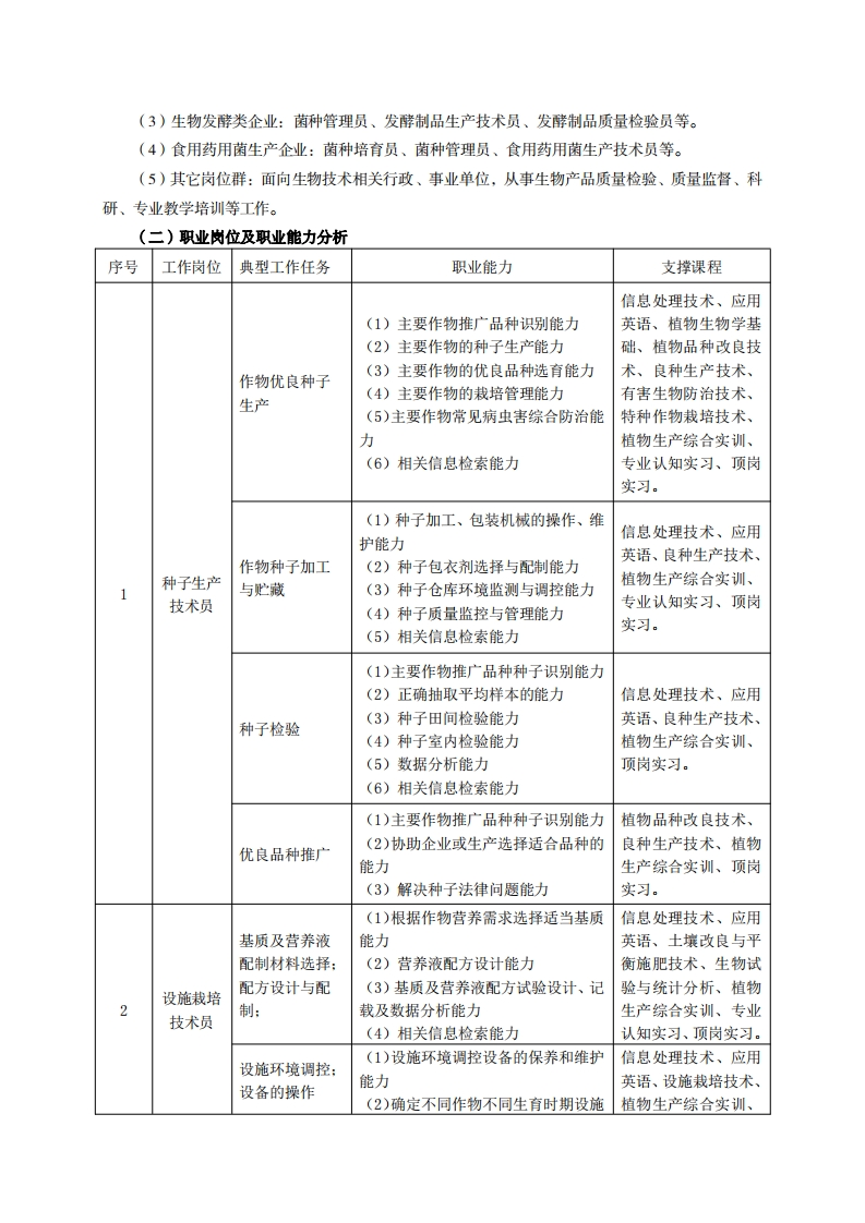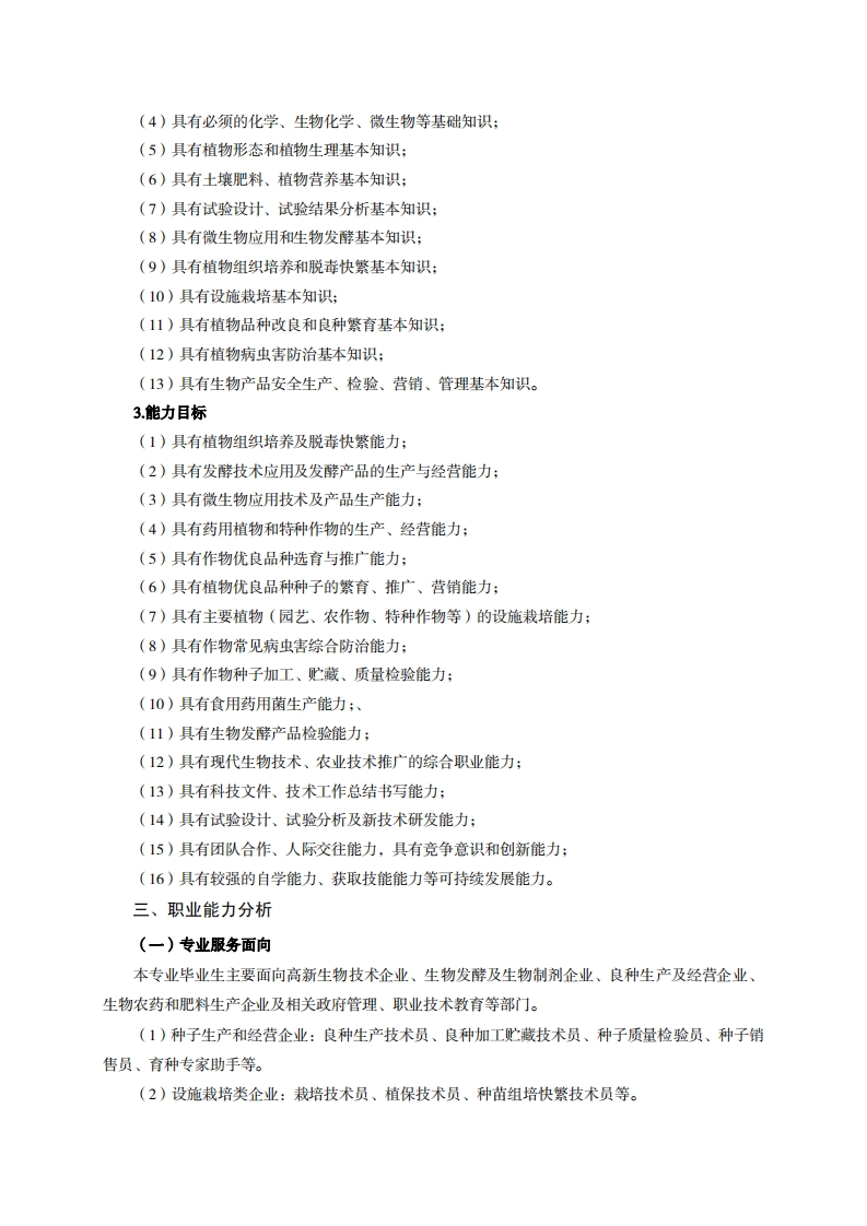 高等职业技术教育《农业生物技术》专业人才培养方案(普招三年制)专业代码:470103一、学制及招生对象(一)学制:三年。(二)招生对象:高中(中职)毕业生。(三)招生类型:文理兼收。二、培养目标与人才规格(一)培养目标本专业培养德、智、体、美、劳全面发展,具有较高综合素质、良好职业道德、创新精神和创业意识,掌握良种生产、设施栽培、生物发酵和微生物应用等方面的基础理论和专业知识,具备植物组培快繁、生物肥料农药生产及应用、生物发酵制品生产、食用药用菌生产等专业能力,在种子生产和经营企业、设施栽培类企业、生物发酵类企业、食用药用菌生产企业从事产品的生产、检验、管理、销售、协助研发等工作的第一线需要的技术技能人才。(二)人才规格1.素质目标(1)思想政治素质:系统掌握马克思主义基本原理和马克思主义中国化理论成果,了解党史、新中国史、改革开放史、社会主义发展史,认识世情、国情、党情,深刻领会习近平新时代中国特色社会主义思想,培养运用马克思主义立场观点方法分析和解决问题的能力;自觉践行社会主义核心价值观,尊重和维护宪法法律权威,识大局、尊法治、修美德:矢志不渝听党话跟党走,争做社会主义合格建设者和可靠接班人。(2)职业素质:具有良好的职业安全、环境保护意识、职业道德、创新精神、创业意识,能够立足生产、建设、管理、服务一线,踏实进取,敬业奉献,善于合作,敢于竞争,勇于创新。(3)人文科学素质:具有宽阔的视野、良好的科学思维品质、高雅的审美情趣和正确的审美观:能够正确认识社会、主动适应社会,有较强文字和语言表达能力,有较强的人际交往能力和自我发展能力。(4)身体心理索质:具有健康的身体,良好的生活习惯,爱好体育运动,有一定的运动基础。具有健康积极的人生态度,良好的个性心理品质,有较强的心理调适能力和抗挫折能力。2.知识目标(1)具有必须的公共英语听、说、读、写基本知识和职业英语知识:(2)具有必备的文化基础知识和人文社会科学知识:(3)具有计算机应用基本知识: