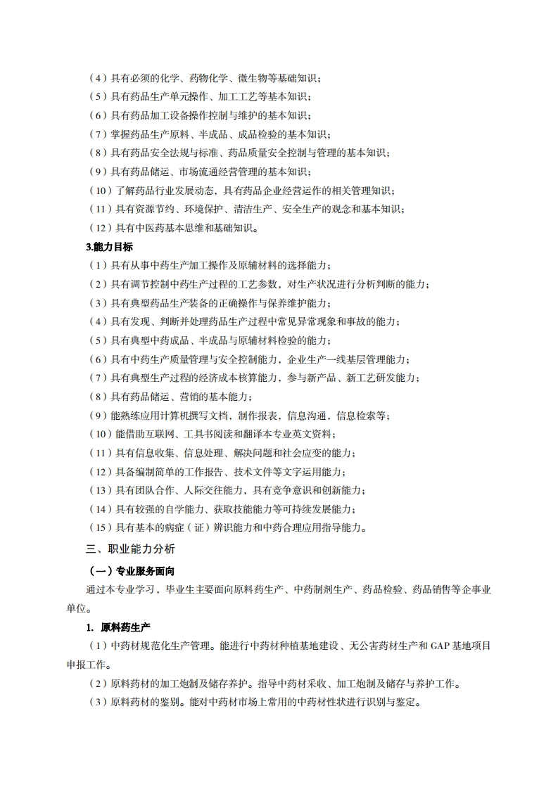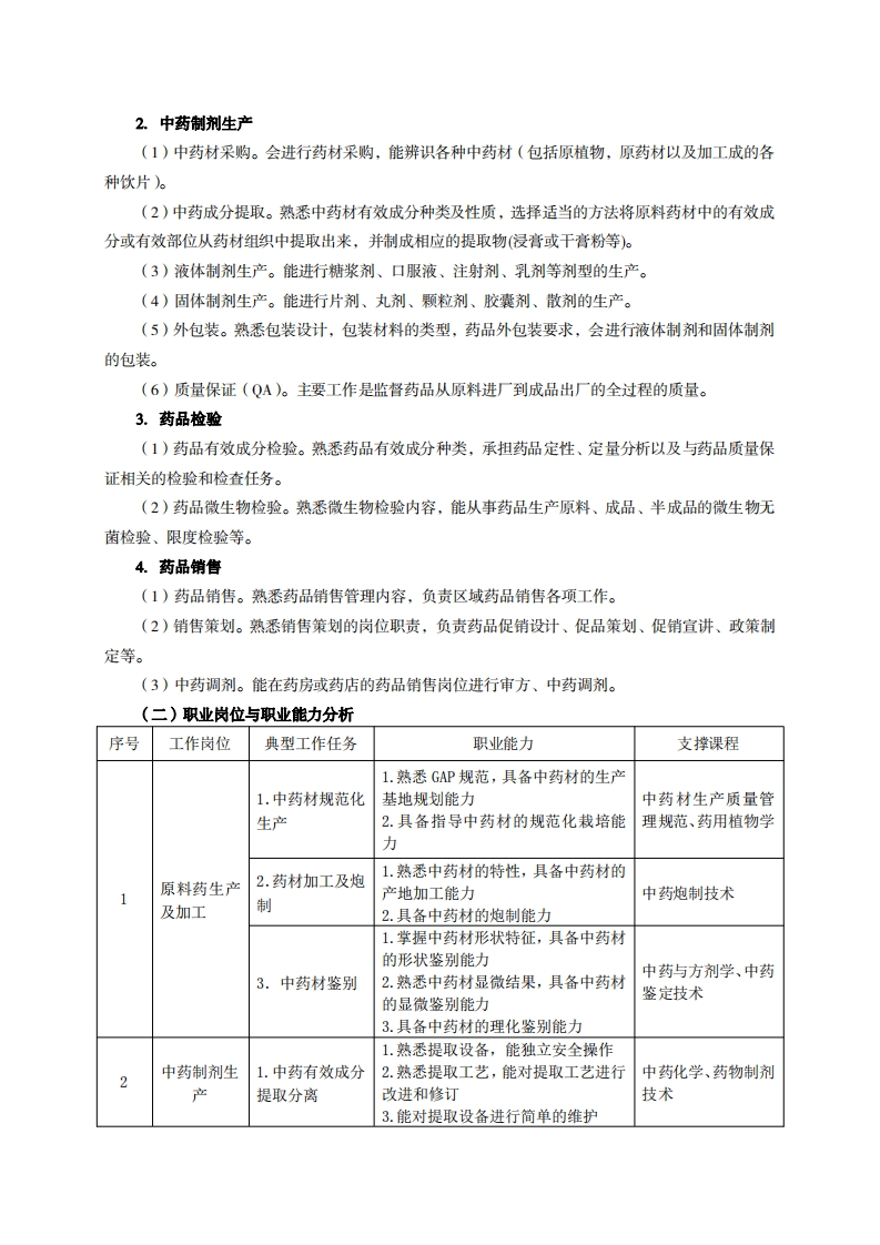 高等职业技术教育《中药制药》专业人才培养方案(普招三年制)专业代码:520415一、学制及招生对象(一)学制:三年(二)招生对象:高中(中职)毕业生(三)招生类型:文理兼收二、培养目标与人才规格(一)培养目标本专业培养德、智、体、美、劳全面发展,具有较高综合素质、良好职业道德、创渐精神和创业意识,掌握中药与方剂学、营销学、基础医学等基本知识,具备中药材规范化种植管理、中药饮片炮制、制剂、检验及营销能力,在中药材规范化栽培、饮片生产、原料药提取、调剂、中成药生产、检验及营销等岗位从事中药材种植质量管理、原药材采购、中药炮制、中成药生产、药物分析、药品经营与管理等方面工作的生产、建设、服务和管理第一线需要的高素质技术技能人才。(二)人才规格1.素质目标(1)思想政治素质:系统掌握马克思主义基本原理和马克思主义中国化理论成果,了解党史、新中国史、改革开放史、社会主义发展史,认识世情、国情、党情,深刻领会习近平新时代中国特色社会主义思想,培养运用马克思主义立场观点方法分析和解决问题的能力:自觉践行社会主义核心价值观,尊重和维护宪法法律权威,识大局、尊法治、修美德:矢志不渝听党话跟党走,争做社会主义合格建设者和可靠接班人。(2)职业素质:具有良好的职业安全、环境保护意识、职业道德、创新精神、创业意识,能够立足生产、建设、管理、服务一线,踏实进取,敬业奉献,善于合作,敢于竞争,勇于创新。(3)人文科学素质:具有宽阔的视野、良好的科学思维品质、高雅的审美情趣和正确的审美观:能够正确认识社会、主动适应社会,有较强文字和语言表达能力,有较强的人际交往能力和自我发展能力。(4)身体心理素质:具有健康的身体,良好的生活习惯,爱好体育运动,有一定的运动基础。具有健康积极的人生态度,良好的个性心理品质,有较强的心理调适能力和抗挫折能力。2知识目标(1)具有必须的公共英语听、说、读、写基本知识和职业英语知识:(2)具有必备的文化基础知识和人文社会科学知识:(3)具有计算机应用的基本知识: