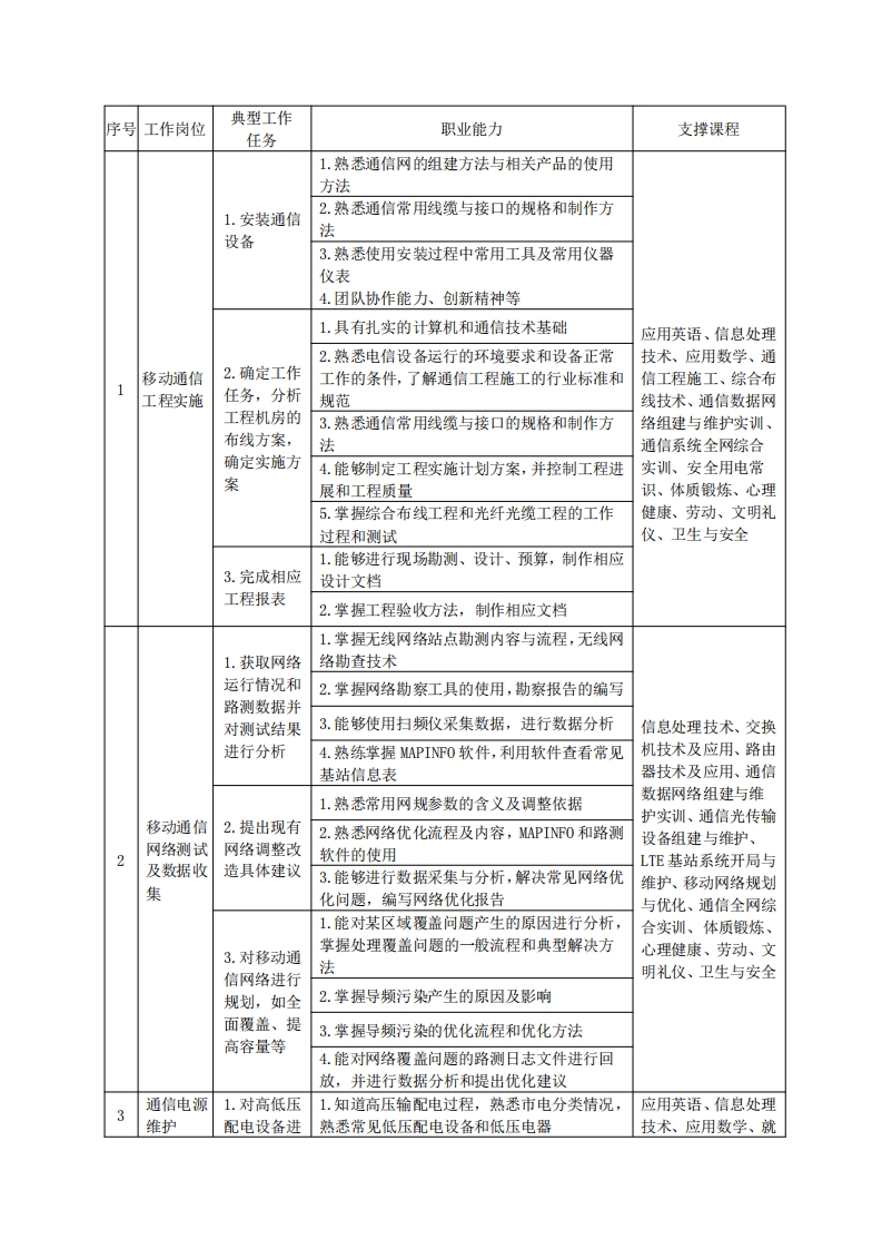 高等职业技术教育《现代通信技术》专业人才培养方案(普招三年制)专业代码:510301一、学制及招生对象(一)学制:三年。(二)招生对象:高中(中职)毕业生。(三)招生类型:文理兼收。二、培养目标与人才规格(一)培养目标本专业培养德、智、体、美、劳全面发展,具有较高综合素质、良好职业道德、创新精神和创业意识,掌握数字通信原理、移动通信技术、LTE基站运行维护、数据网组建、通信网络优化的基本理论知识,具备移动通信系统及其设备运行、检测、维护、优化、移动终端设备检修及移动通信工程技术管理能力,在通信技术行业从事通信设备制造、通信设备组网、运行维护,通信工程实施工作的生产、建设、服务和管理第一线需要的高素质技术技能人才。(二)人才规格1.素质目标(1)思想政治素质:系统掌握马克思主义基本原理和马克思主义中国化理论成果,了解党史、新中国史、改革开放史、社会主义发展史,认识世情、国情、党情,深刻领会习近平新时代中国特色社会主义思想,培养运用马克思主义立场观点方法分析和解决问题的能力:自觉践行社会主义核心价值观,尊重和维护宪法法律权威,识大局、尊法治、修美德:矢志不渝听党话跟党走,争做社会主义合格建设者和可靠接班人。(2)职业索质:具有良好的职业安全、环境保护意识、职业道德、创新精神、创业意识,能够立足生产、建设、管理、服务一线,踏实进取,敬业奉献,善于合作,敢于竞争,勇于创新。(3)人文科学素质:具有宽阔的视野、良好的科学思维品质、高雅的审美情趣和正确的审美观:能够正确认识社会、主动适应社会,有较强文字和语言表达能力,有较强的人际交往能力和自我发展能力。(4)身体心理素质:具有健康的身体,良好的生活习惯,爱好体育运动,有一定的运动基础。具有健康积极的人生态度,良好的个性心理品质,有较强的心理调适能力和抗挫折能力。2.知识目标(1)具有必须的公共英语听、说、读、写基本知识和职业英语知识: