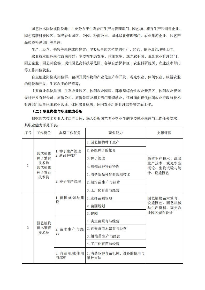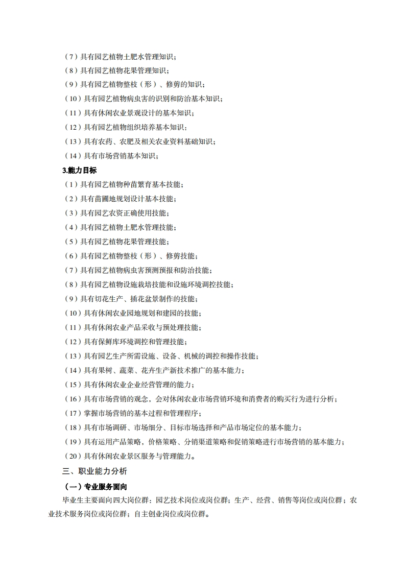 高等职业技术教育《休闲农业》专业人才培养方案(普招三年制)专业代码:510105一、学制及招生对象(一)学制:三年。(二)招生对象:高中(中职)毕业生。(三)招生类型:文理兼收二、培养目标与人才规格(一)培养目标本专业培养德、智、体、美、劳全面发展,具有较高综合素质、良好职业道德、创新精神和创业意识,面向都市休闲农业园、农工贸企业集团,星级休闲农庄和旅游观光技术服务组织就业,培养具有都市现代休闲农业规划设计能力与创新能力,从事都市休闲农业创意规划设计与管理、现代农业科技园区规划设计与管理、休闲农业创意规划设计与管理等方面工作的高素质、创新型高端技术技能人才。(二)人才规格1素质目标(1)思想政治素质:拥护党的基本路线,具有坚定正确的政治方向:掌握毛泽东思想和邓小平理论以及“三个代表”的重要思想和科学发展观:具有正确的世界观、人生观和价值观,具有良好的诚信品质、敬业精神、责任意识、团队意识和诚信意识,格守公民基本道德规范。(2)职业素质:具有良好的职业安全、环境保护意识、职业道德、创新精神、创业意识,能够立足生产、建设、管理、服务一线,踏实进取,敬业奉献,善于合作,敢于竞争,勇于创新。(3)人文科学素质:具有宽阔的视野、良好的科学思维品质、高雅的审美情趣和正确的审美观:能够正确认识社会、主动适应社会,有较强文字和语言表达能力,有较强的人际交往能力和自我发展能力。(4)身体心理素质:具有健康的身体,良好的生活习惯,爱好体育运动,有一定的运动基础。具有健康积极的人生态度,良好的个性心理品质,有较强的心理调适能力和抗挫折能力。2知识目标(1)具有必备的文化基础知识和人文社会科学知识:(2)具有计算机应用的基本知识:(4)具有植物学、植物生理学、微生物学等基础知识:(5)具有农资产品正确使用基本知识:(6)具有园艺植物种苗繁育基本知识: