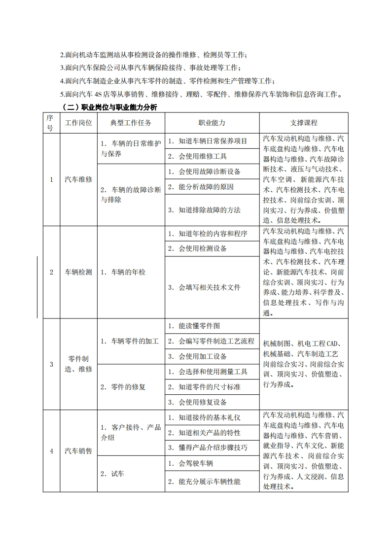高等职业技术教育《汽车制造与试验技术》专业人才培养方案(普招三年制)专业代码:460701一、学制及招生对象(一)学制:三年。(二)招生对象:高中(中职)毕业生。(三)招生类型:理科。二、培养目标与人才规格(一)培养目标本专业培养德、智、体、美、劳全面发展,具有较高综合素质、良好职业道德、创新精神和创业意识,掌握汽车性能检测、汽车故障诊断与排除、汽车营销、机械加工、汽车保险理赔等方面的知识,具备汽车安全环保和综合性能检测、汽车维修、汽车销售、机械零部件的加工工艺、汽车保险的受理和现场理赔的能力,在汽车制造厂、零配件制造企业、汽车检测站、汽车维修企业、汽车销售企业、4S店、保险公司等部门,从事汽车制造、机动车检测、汽车维修保养、保险理赔、汽车营销和技术咨询服务等第一线需要的高素质技术技能人才。(二)人才规格1.素质目标(1)思想政治素质:系统掌握马克思主义基本原理和马克思主义中国化理论成果,了解党史、新中国史、改革开放史、社会主义发展史,认识世情、国情、党情,深刻领会习近平新时代中国特色社会主义思想,培养运用马克思主义立场观点方法分析和解决问题的能力;自觉践行社会主义核心价值观,尊重和维护宪法法律权威,识大局、尊法治、修美德:矢志不渝听党话跟党走,争做社会主义合格建设者和可靠接班人。(2)职业素质:具有良好的职业安全、环境保护意识、职业道德、创新精神、创业意识,能够立足生产、建设、管理、服务一线,踏实进取,敬业奉献,善于合作,敢于竞争,勇于创新。(3)人文科学素质:具有宽阔的视野、良好的科学思维品质、高雅的审美情趣和正确的审美观;能够正确认识社会、主动适应社会,有较强文字和语言表达能力,有较强的人际交往能力和自我发展能力。(4)身体心理素质:具有健康的身体,良好的生活习惯,爱好体育运动,有一定的运动基础。具有健康积极的人生态度,良好的个性心理品质,有较强的心理调适能力和抗挫折能力。2知识目标(1)具有必须的公共英语听、说、读、写基本知识和职业英语知识;(2)具有必备的文化基础知识和人文社会科学知识: