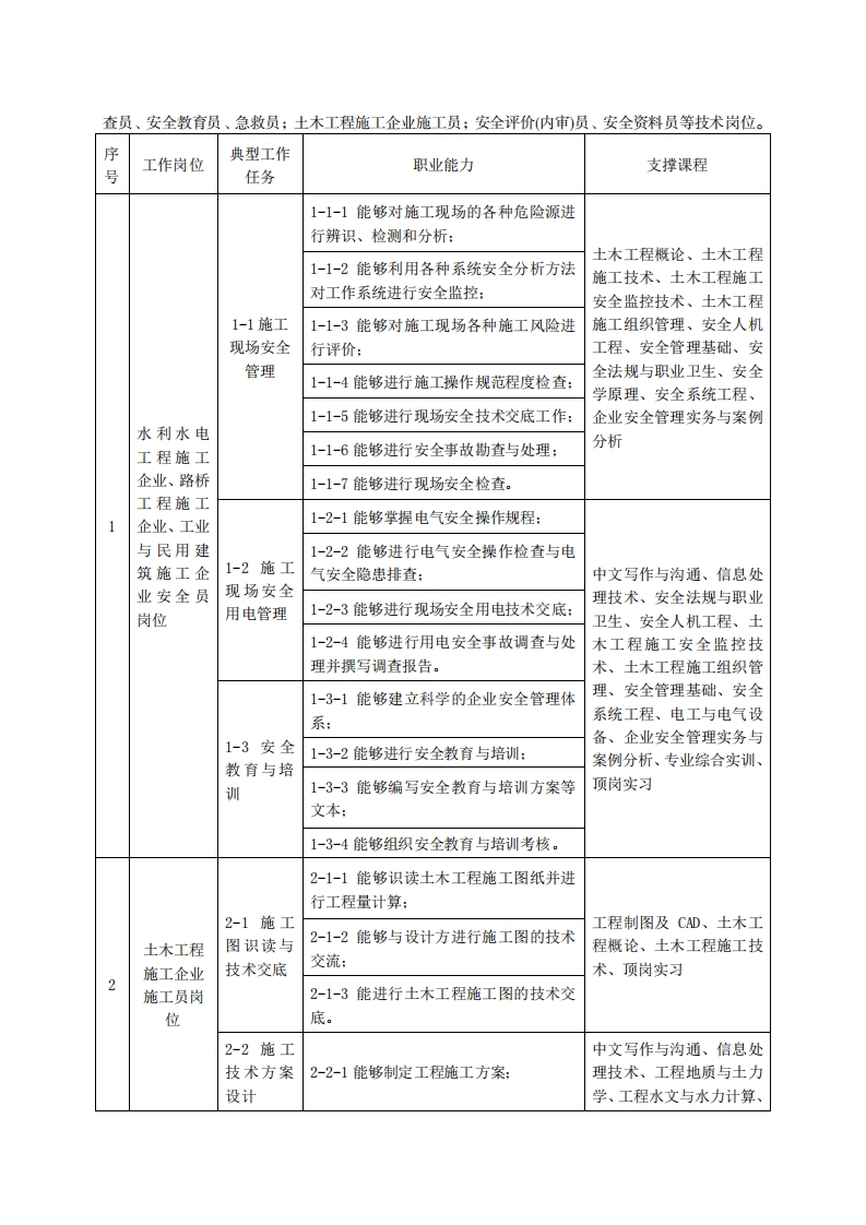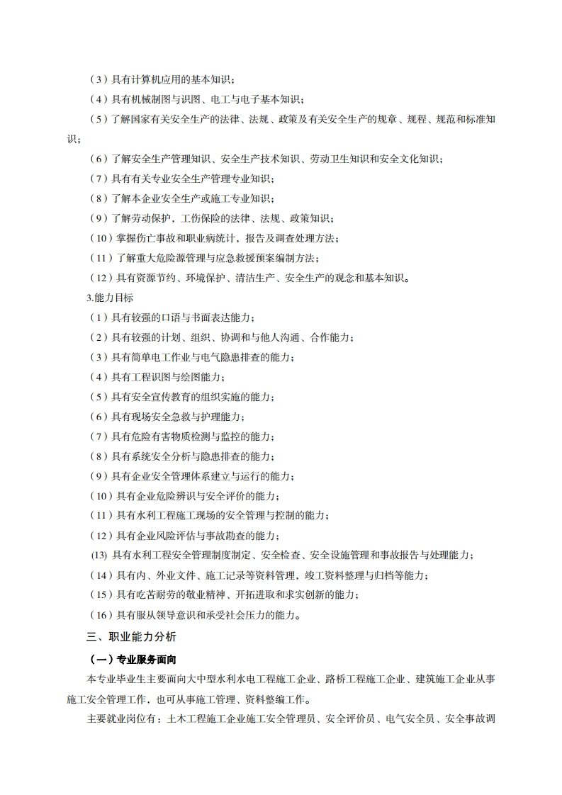 高等职业技术教育《安全技术与管理》专业人才培养方案(普招三年制)专业代码:520901一、学制及招生对象(一)学制:三年(二)招生对象:高中(中职)毕业生(三)招生类型:理科二、培养目标与人才规格(一)培养目标本专业培养德、智、体、美、劳全面发展,具有较高综合素质、良好职业道德、创新精神和创业意识,掌握土建工程安全管理和施工知识,具备从事安全设计、评价、监测与监督、预防控制与技术管理、施工等工作的能力,在土木工程施工企业安全员岗位从事现场安全监测与检查、安全评价、安全教育与培训、企业安全管理等工作,也可以在土木工程施工企业施工员岗位和资料员岗位从事施工、资料整编等工作的生产、建设、服务和管理第一线需要的高素质技术技能人才。(二)人才规格1素质目标1.素质目标(1)思想政治素质:拥护党的基本路线,具有坚定正确的政治方向:掌握毛泽东思想和邓小平理论以及“三个代表”的重要思想和科学发展观;具有正确的世界观、人生观和价值观,具有良好的诚信品质、敬业精神、责任意识、团队意识和诚信意识,格守公民基本道德规范。(2)职业素质:具有良好的职业安全、环境保护意识、职业道德、创新精神、创业意识,能够立足生产、建设、管理、服务一线,踏实进取,敏业奉献,善于合作,敢于竞争,勇于创新。(3)人文科学素质:具有宽阔的视野、良好的科学思维品质、高雅的审美情趣和正确的审美观:能够正确认识社会、主动适应社会,有较强文字和语言表达能力,有较强的人际交往能力和自我发展能力。(4)身体心理素质:具有健康的身体,良好的生活习惯,爱好体育运动,有一定的运动基础。具有健康积极的人生态度,良好的个性心理品质,有较强的心理调适能力和抗挫折能力。2.知识目标(1)具有必须的公共英语听、说、读、写基本知识和职业英语知识:(2)具有必备的文化基础知识和人文社会科学知识: