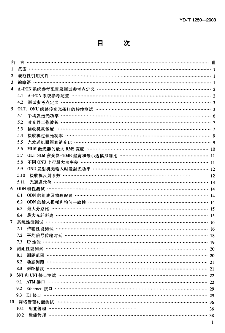 YD-T1250-2003348072@abc4个月前发布关注私信1.83MB46页046YD-T1250-2003此内容为付费资源,请付费后查看¥21¥31黄金会员免费钻石会员免费立即购买您当前未登录!建议登陆后购买,可保存购买订单付费资源 第1页 / 共46页 第2页 / 共46页 试读已结束,还剩44页,您可下载完整版后进行离线阅读 THE END标准规范 文本预览 1CS33.040.50M42YD中华人民共和国通信行业标准YD/T1250-2003接入网测试方法一基于ATM的无源光网络(A-PON)Test method for access networkpassive optical network based on ATM (A-PON)2003-01-22发布2003-01-22实施中华人民共和国信息产业都发布 查看更多 收起部分 喜欢就支持一下吧收藏