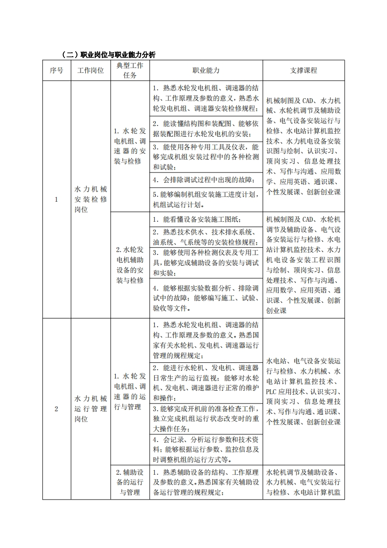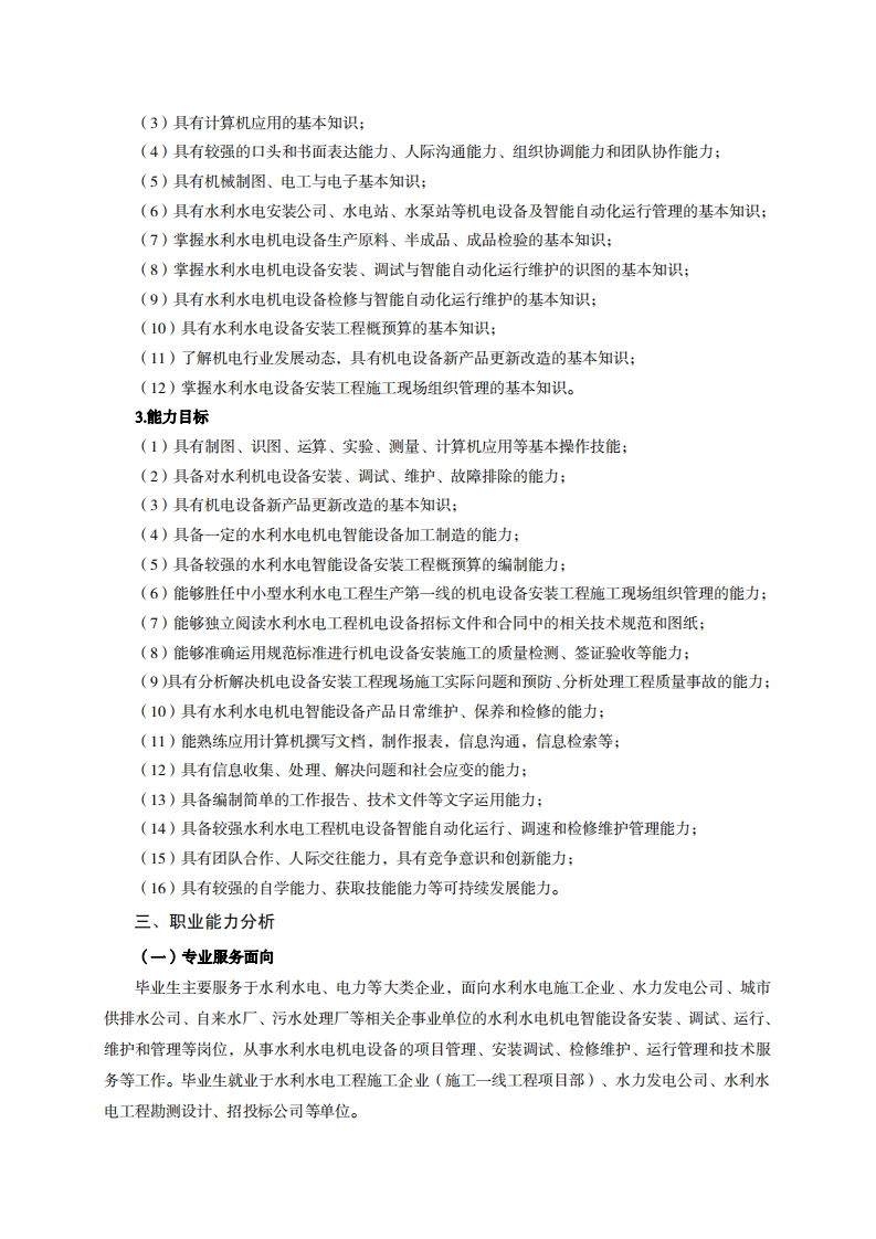 高等职业技术教育《水利机电设备智能管理》专业人才培养方案(单招三年制)专业代码:450303一、学制及招生对象(一)学制:三年。(二)招生对象:高中(中职)毕业生。(三)招生类型:理科。二、培养目标与人才规格(一)培养目标本专业培养德、智、体、美、劳全面发展,具有较高综合素质、良好职业道德、创新精神和创业意识,掌握水利水电工程机电设备的安装检修、调试维护、运行管理和技术服务的理论知识,具备水利水电机电设备的安装、检修、操作、维护和管理等能力,在水利水电施工企业、工程咨询公司、水电(泵)站、城市供排水、污水处理等企业从事机电设备智能自动化技术服务工作的建设、管理、生产和服务第一线需要的高素质技术技能人才。(二)人才规格1素质目标(1)思想政治素质:系统掌握马克思主义基本原理和马克思主义中国化理论成果,了解党史、新中国史、改革开放史、社会主义发展史,认识世情、国情、党情,深刻领会习近平新时代中国特色社会主义思想,培养运用马克思主义立场观点方法分析和解决问题的能力;自觉践行社会主义核心价值观,尊重和维护宪法法律权威,识大局、尊法治、修美德:矢志不渝听党话跟党走,争做社会主义合格建设者和可靠接班人。(2)职业素质:具有良好的职业安全、环境保护意识、职业道德、创新精神、创业意识,能够立足生产、建设、管理、服务一线,踏实进取,敬业奉献,善于合作,敢于竞争,勇于创新。(3)人文科学素质:具有宽阔的视野、良好的科学思维品质、高雅的审美情趣和正确的审美观:能够正确认识社会、主动适应社会,有较强文字和语言表达能力,有较强的人际交往能力和自我发展能力。(4)身体心理素质:具有健康的身体,良好的生活习惯,爱好体育运动,有一定的运动基础。具有健康积极的人生态度,良好的个性心理品质,有较强的心理调适能力和抗挫折能力。2.知识目标(1)具有必须的公共英语听、说、读、写基本知识和职业英语知识;(2)具有必备的文化基础知识和人文社会科学知识: