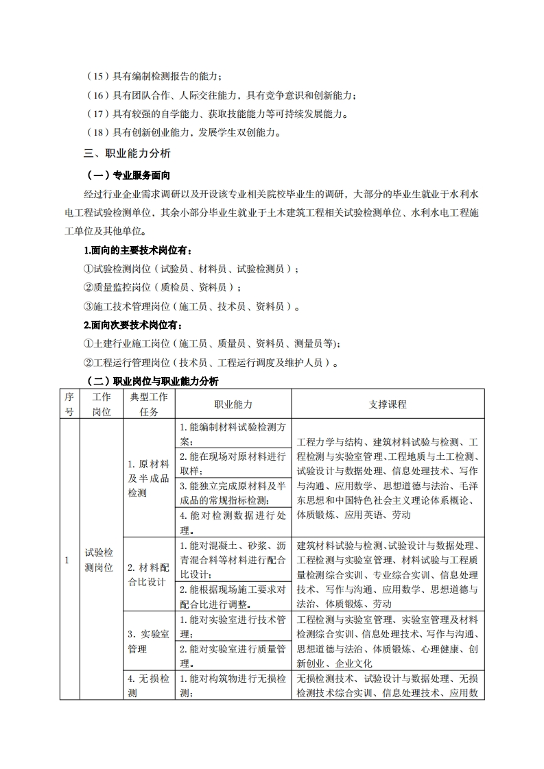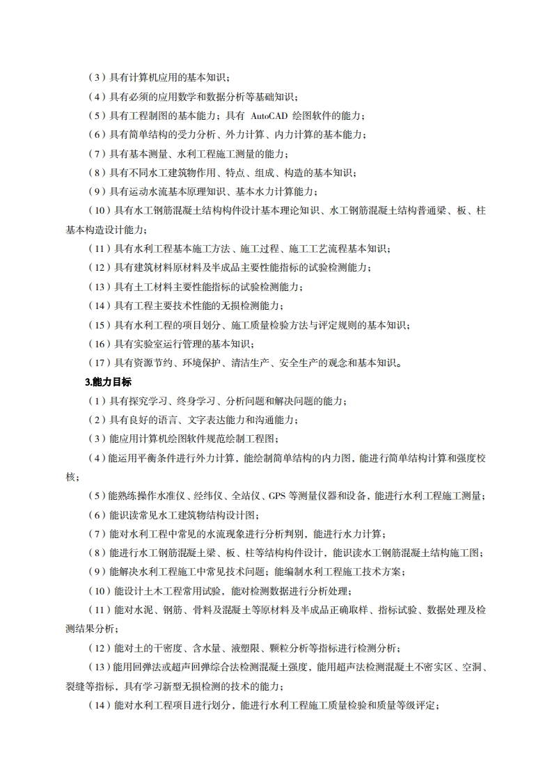 高等职业技术教育《水利水电工程技术》专业人才培养方案(单招三年制)专业代码:450203一、学制及招生对象(一)学制:三年。(二)招生对象:高中(中职)毕业生。(三)招生类型:文理兼收。二、培养目标与人才规格(一)培养目标本专业培养德、智、体、美、劳全面发展,具有较高综合素质、良好职业道德、创新精神和创业意识,掌握水利水电工程材料检测、施工质量控制、施工、工程项目管理等方面的专业基础理论知识,具备较强的试验检测、施工质量控制、施工、工程项目管理等能力,在水利水电工程检测及施工企业,从事水利水电工程材料试验检测、施工质量监控、施工及工程项目管理等工作的生产、建设、服务和管理第一线需要的高素质技术技能人才。(二)人才规格1.素质目标(1)思想政治素质:系统掌握马克思主义基本原理和马克思主义中国化理论成果,了解党史、新中国史、改革开放史、社会主义发展史,认识世情、国情、党情,深刻领会习近平新时代中国特色社会主义思想,培养运用马克思主义立场观点方法分析和解决问题的能力;自觉践行社会主义核心价值观,尊重和维护宪法法律权威,识大局、尊法治、修美德;矢志不渝听党话跟党走,争做社会主义合格建设者和可靠接班人。(2)职业素质:具有良好的职业安全、环境保护意识、职业道德、创新精神、创业意识,能够立足生产、建设、管理、服务一线,踏实进取,敬业奉献,善于合作,敢于竞争,勇于创新。(3)人文科学素质:具有宽阔的视野、良好的科学思维品质、高雅的审美情趣和正确的审美观:能够正确认识社会、主动适应社会,有较强文字和语言表达能力,有较强的人际交往能力和自我发展能力。(4)身体心理素质:具有健康的身体,良好的生活习惯,爱好体育运动,有一定的运动基础。具有健康积极的人生态度,良好的个性心理品质,有较强的心理调适能力和抗挫折能力。2.知识目标(1)具有必须的公共英语听、说、读、写基本知识和职业英语知识:(2)具有必备的文化基础知识和人文社会科学知识: