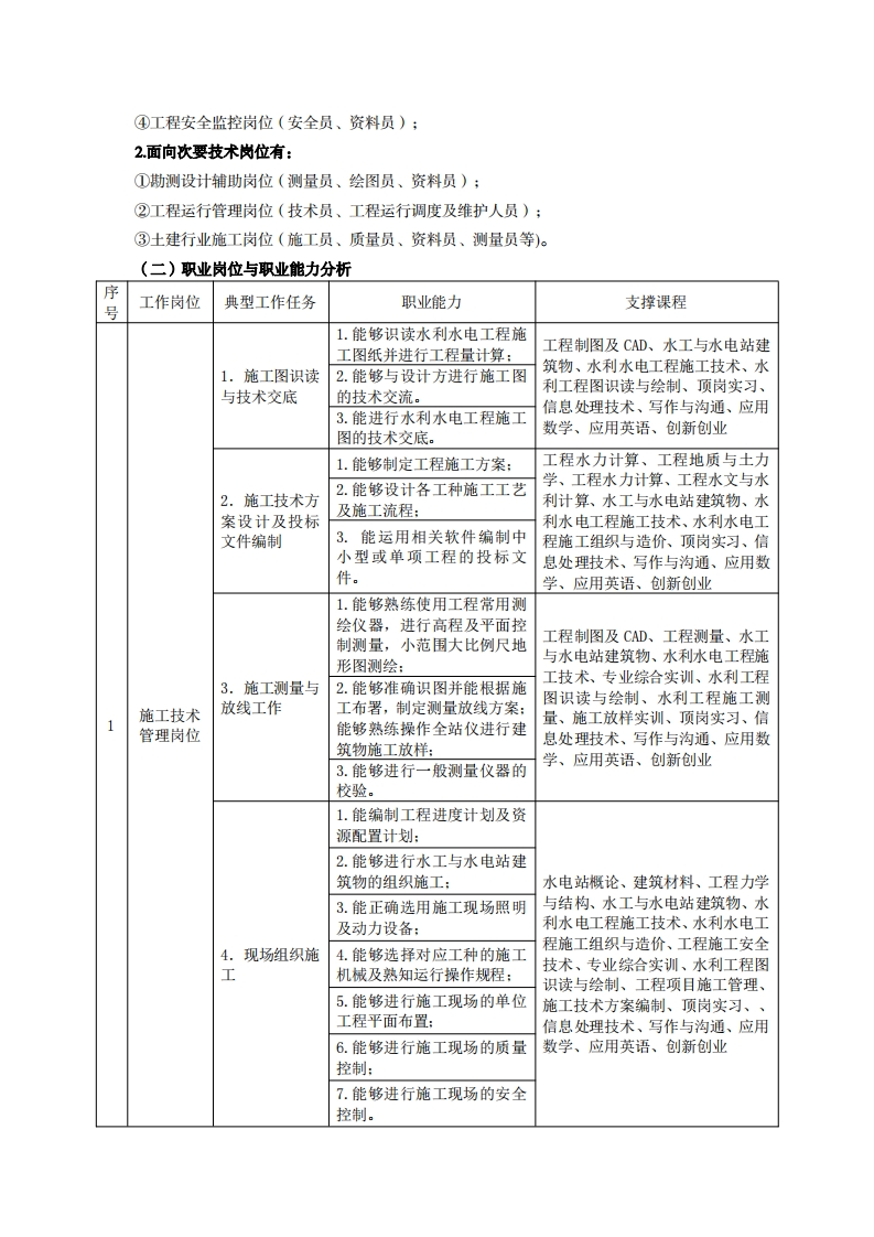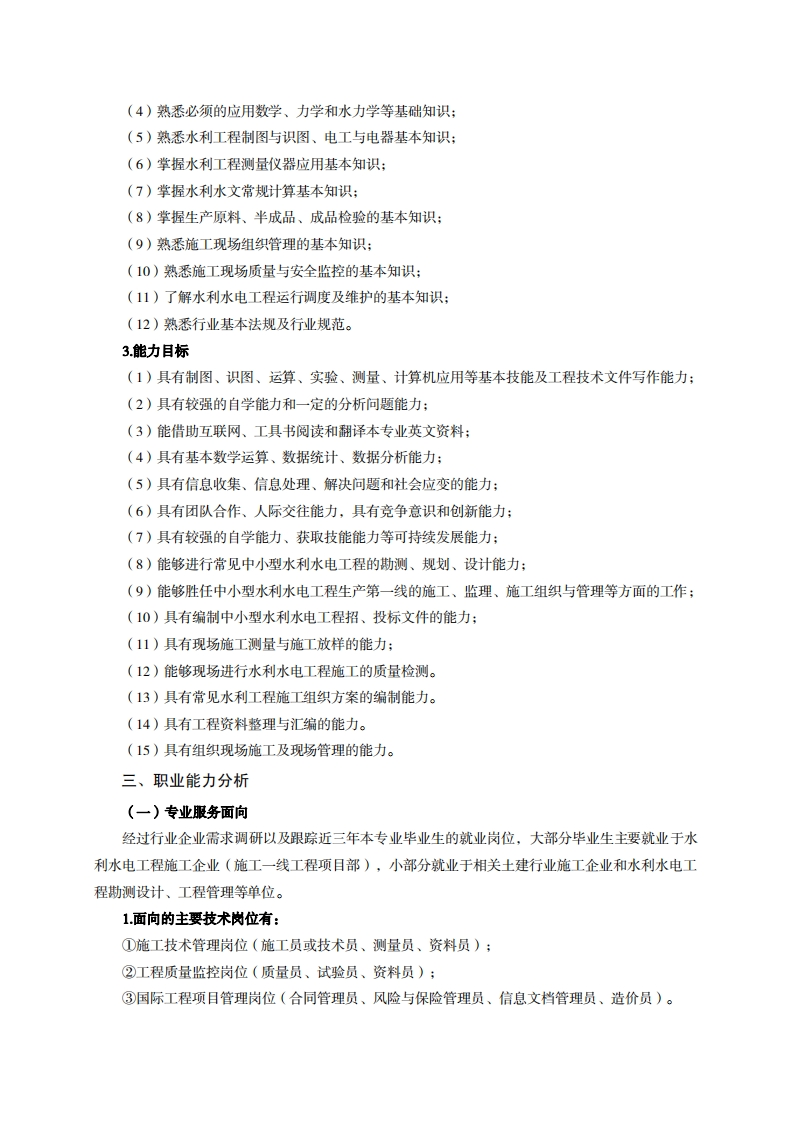 高等职业技术教育《水利水电建筑工程》专业人才培养方案(单招三年制)专业代码:450205一、学制及招生对象(一)学制:三年。(二)招生对象:高中(中职)毕业生。(三)招生类型:理科。二、培养目标与人才规格(一)培养目标本专业培养德、智、体、美、劳全面发展,具有较高综合素质、良好职业道德、创新精神和创业意识,掌握水利水电工程设计、施工、管理等方面的专业基础理论知识,具备较强的施工技术、质量控制、项目管理等实践能力,在水利水电施工企业,从事水利水电工程现场施工、工程质量监控、工程施工现场安全监控、工程项目管理及常见单体水工建筑物的勘测设计等工作的生产、建设、服务和管理第一线需要的高素质技术技能人才。(二)人才规格1.素质目标(1)思想政治素质:系统掌握马克思主义基本原理和马克思主义中国化理论成果,了解党史、新中国史、改革开放史、社会主义发展史,认识世情、国情、党情,深刻领会习近平新时代中国特色社会主义思想,培养运用马克思主义立场观点方法分析和解决问题的能力:自觉践行社会主义核心价值观,尊重和维护宪法法律权威,识大局、尊法治、修美德:矢志不渝听党话跟党走,争做社会主义合格建设者和可靠接班人。(2)职业素质:具有良好的职业安全、环境保护意识、职业道德、创新精神、创业意识,能够立足生产、建设、管理、服务一线,踏实进取,敬业奉献,善于合作,敢于竞争,勇于创新。(3)人文科学素质:具有宽阔的视野、良好的科学思维品质、高雅的审美情趣和正确的审美观:能够正确认识社会、主动适应社会,有较强文字和语言表达能力,有较强的人际交往能力和自我发展能力。(4)身体心理素质:具有健康的身体,良好的生活习惯,爱好体育运动,有一定的运动基础。具有健康积极的人生态度,良好的个性心理品质,有较强的心理调适能力和抗挫折能力。2知识目标(1)熟悉必须的公共英语听、说、读、写基本知识和职业英语知识:(2)了解必备的文化基础知识和人文社会科学知识:(3)掌握计算机应用的基本知识: