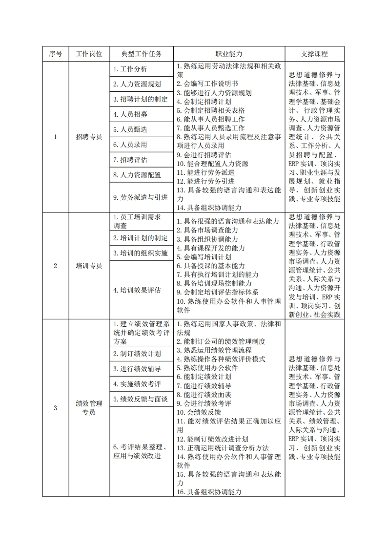 高等职业技术教育《人力资源管理》专业人才培养方案(普招三年制)专业代码:690202一、学制及招生对象(一)学制:三年。(二)招生对象:高中(中职)毕业生。(三)招生类型:文理兼收。二、培养目标与人才规格(一)培养目标本专业培养德、智、体全面发展,具有较高综合素质、良好职业道德、创新精神和创业意识,掌握人力资源的招聘培训、绩效考核、薪酬设计等基本理论知识,具备较强的分析问题、解决问题的能力和企业管理与人力资源管理能力,能在企事业单位及相关政府部门从事人力资源规划、招聘与配置、培训与开发、绩效管理、薪酬福利管理、劳动关系管理等人力资源服务和管理第一线需要的高素质技术技能人才。(二)人才规格1.素质目标(1)思想政治素质:拥护党的基本路线,具有坚定正确的政治方向:掌握毛泽东思想和邓小平理论以及“三个代表”的重要思想和科学发展观:具有正确的世界观、人生观和价值观,具有良好的敬业精神、责任意识、团队意识,恪守公民基本道德规范。(2)职业素质:具有良好的职业安全、环境保护意识、职业道德,创新精神、创新意识,能够立足生产、建设、管理、服务一线,踏实进取,敬业奉献,善于合作,敢于竞争,勇于创新。(3)人文科学素质:具有宽阔的视野、良好的科学思维品质、高雅的审美情趣和正确的审美观:能够正确认识社会、主动适应社会,有较强文字和语言表达能力,有较强的人际交往能力和自我发展能力。(4)身体心理素质:具有健康的身体,良好的生活习惯,爱好体育运动,有一定的运动基础:具有健康积极的人生态度,良好的个性心理品质,有较强的心理调适能力和抗挫折能力。2.知识目标(1)掌握管理学、经济学的基本原理和人力资源管理的基本理论、基本知识:(2)熟悉我国人力资源管理的方针、政策和法规:(3)掌握人力资源管理的定性、定量分析方法:(4)了解本专业的理论前沿和发展动态:(5)掌握行政管理、企业管理的理论、方法和原理: