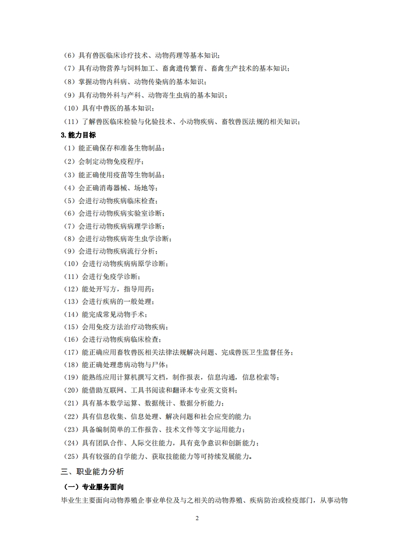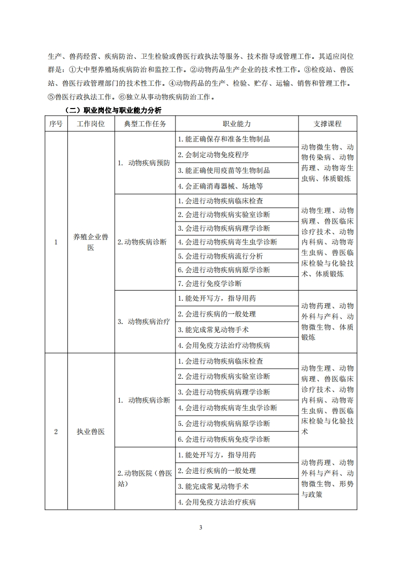 高等职业技术教育《动物医学》专业人才培养方案(普招三年制)专业代码510302一、学制及招生对象(一)学制:三年。(二)招生对象:高中(中职)毕业生。(三)招生类型:文理兼收。二、培养目标与人才规格(一)培养目标本专业培养德、智、体、美等方面全面发展,具有较高综合素质和较强社会适应能力:了解动物疫病发生、发展现状和趋势及相关法律法规,熟悉动物疾病诊断、治疗及预防的基本理论和基本知识,掌握动物疾病控制的基本知识:具备动物疾病防治、检验和检疫的基本技能:能在动物(宠物)医疗机构、养殖场或兽医执法部门等机构,从事动物疾病防控、监督管理、检疫检验和动物用品(产品)的生产营销等相关岗位工作的第一线需要的技术技能人才。(二)人才规格1.素质目标(1)思想政治素质:拥护党的基本路线,具有坚定正确的政治方向:掌握毛泽东思想和邓小平理论以及“三个代表”的重要思想和科学发展观:具有正确的世界观、人生观和价值观,具有良好的诚信品质、敬业精神、责任意识、团队意识和诚信意识,格守公民基本道德规范。(2)职业素质:具有良好的职业安全、环境保护意识、职业道德、创新精神、创业意识,能够立足生产、建设、管理、服务一线,踏实进取,敬业奉献,善于合作,敢于竞争,勇于创新。(3)人文科学素质:具有宽阔的视野、良好的科学思维品质、高雅的审美情趣和正确的审美观:能够正确认识社会、主动适应社会,有较强文字和语言表达能力,有较强的人际交往能力和自我发展能力。(4)身体心理素质:具有健康的身体,良好的生活习惯,爱好体育运动,有一定的运动基础。具有健康积极的人生态度,良好的个性心理品质,有较强的心理调适能力和抗挫折能力。2.知识目标(1)具有必须的公共英语听、说、读、写基本知识和职业英语知识:(2)具有必备的文化基础知识和人文社会科学知识:(3)具有计算机应用的基本知识:(4)具有必须的分析化学、动物解剖、动物生物化学、动物微生物等基础知识:(5)具有动物生理、动物病理的基本知识: